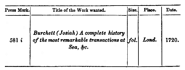 As to the fifth book, it appears from your letter that you required a folio printed at London in 1720. You have, however, given on the ticket the size as 8vo. the place as "fvr," which, may be, is meant for London, and the date 1704. There is in the catalogue a work of Burchett different from the one you wanted, and immediately preceding it, "8vo. Lond. 1704." You mistook this part of the entry of what you did not want, and applied it to what you did.