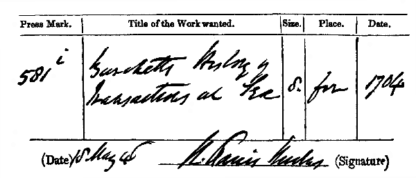 It was found, however, that some readers, who neglected to comply with these rules, hindered the ready supply of books to those who did comply with them; and when, in 1837, I succeeded Mr. Baber as Keeper of the Printed Books Department, I thought of suggesting printed tickets or formulæ, according to which books were to be asked for by merely filling them up. The following is an exact specimen of these tickets:
