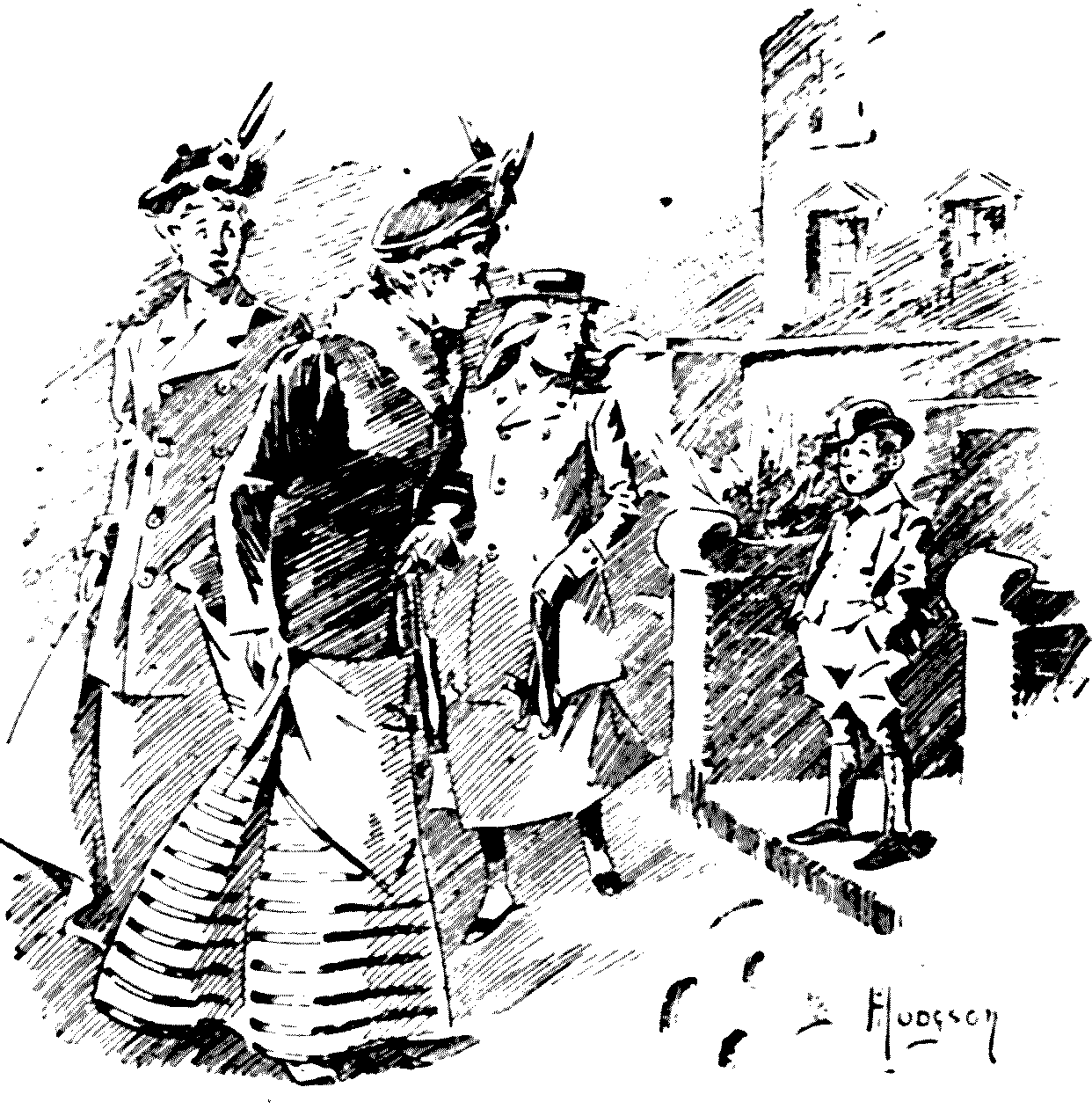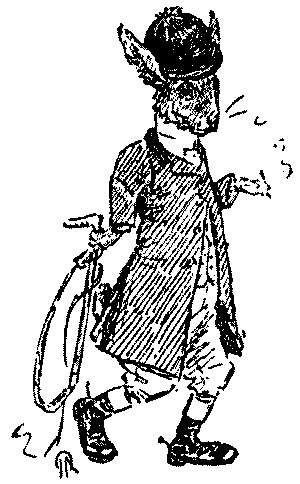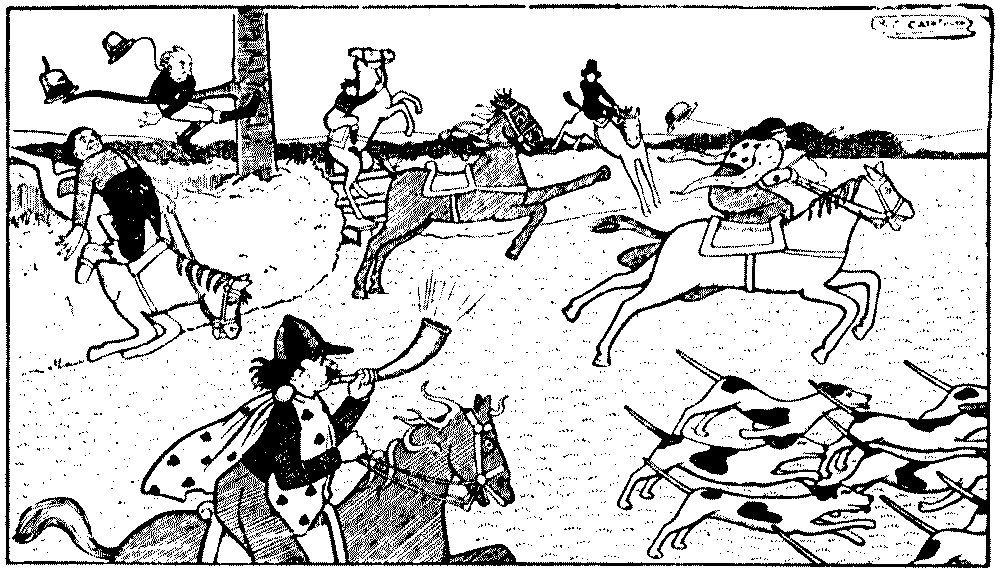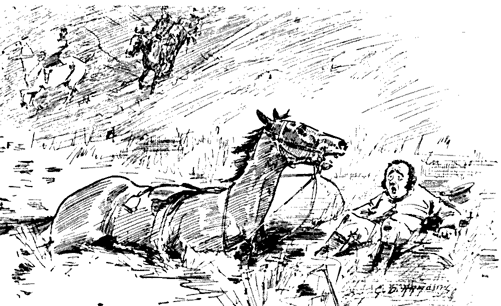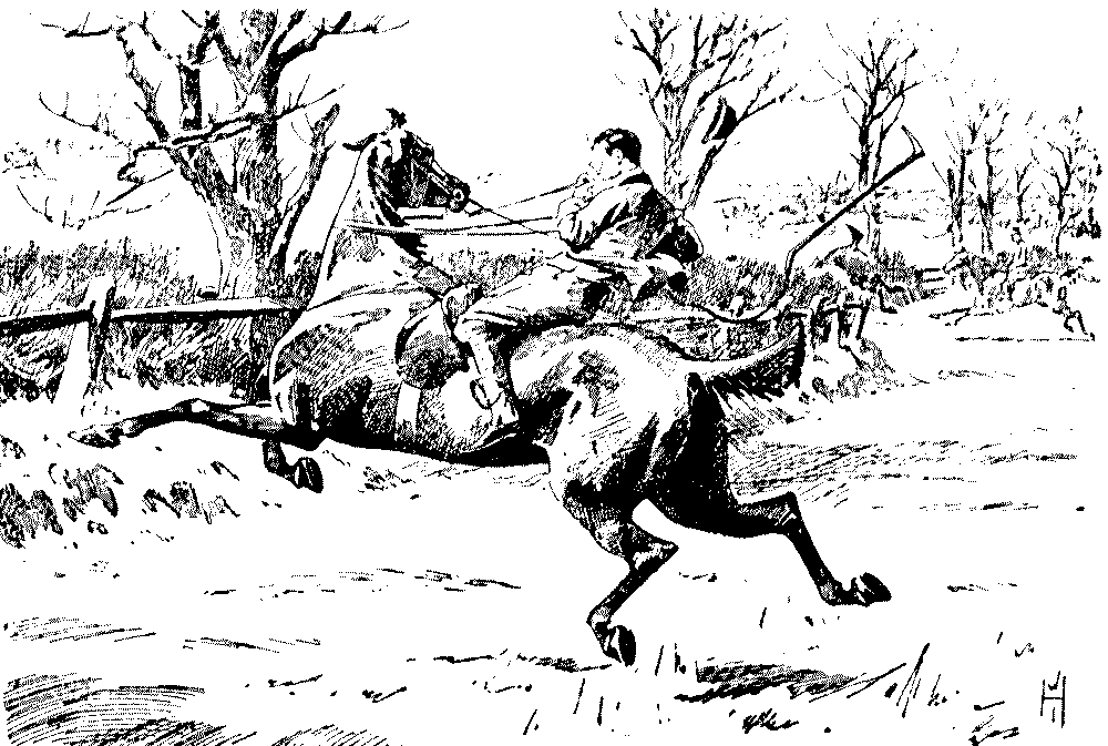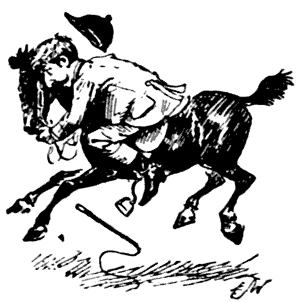 The next moment the starter yelled "Go!" and away, like a whirlwind, we sped across the first field, towards a huge, thick blackthorn fence, the one I had thought to see such fun with. Fun! I never felt less funny in my life, as we approached it at the rate of two thousand miles an hour! The mare jumped high, but I jumped much higher, and seemed for a brief moment to be soaring through the blue empyrean. Somehow, the mare managed to evade me on the return journey earthwards, and, instead of alighting on the saddle, I found myself "sitting on the floor." A howl—it might have been of sympathy, but it didn't sound quite like that—arose from the crowd, and then I thought that I would go home on foot, instead of returning to explain matters to Sir Hercules. As a matter of fact, I don't much care for associating with old Blizzard, at all events, not just now.
