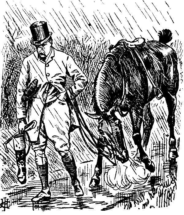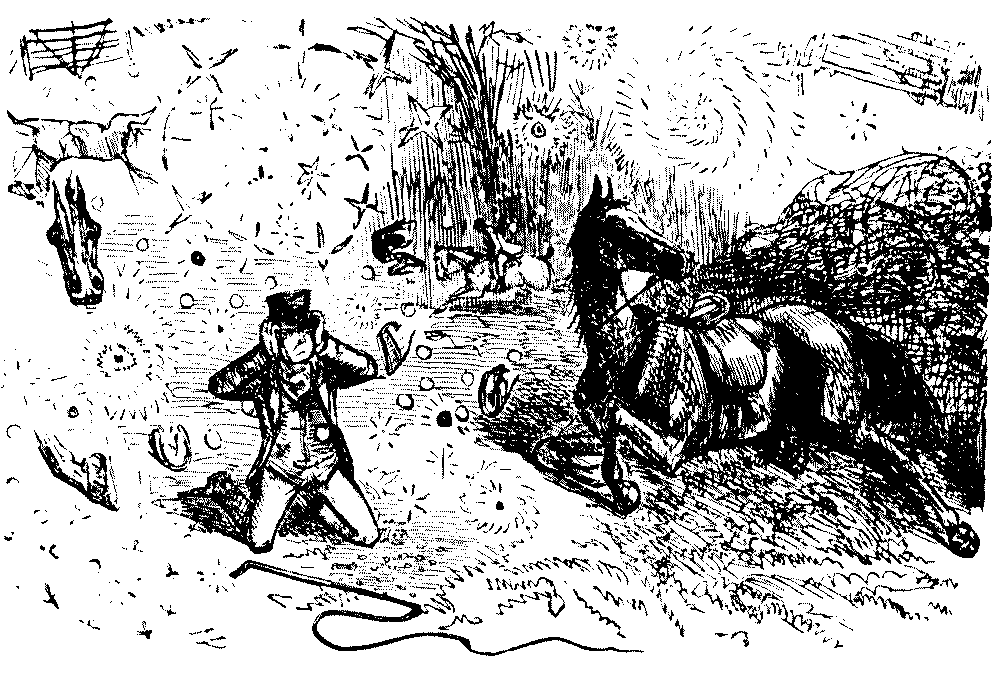 Horrible catastrophe which happened to Captain Fussey (our ladies' man) on his arrival at the opening meet. New coat, new boots, new horse, new everything! Hard luck!