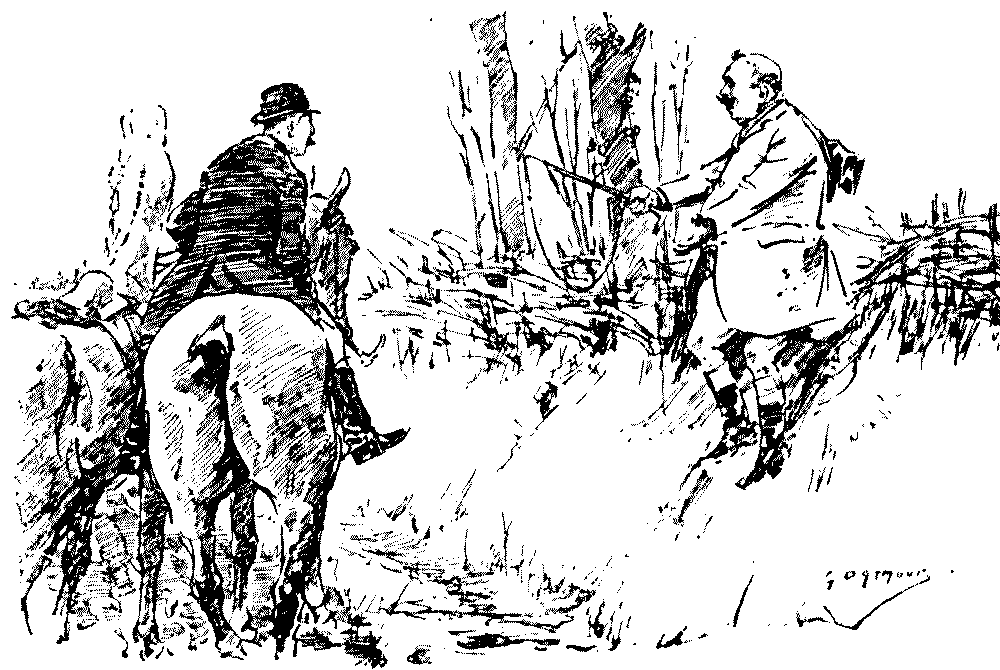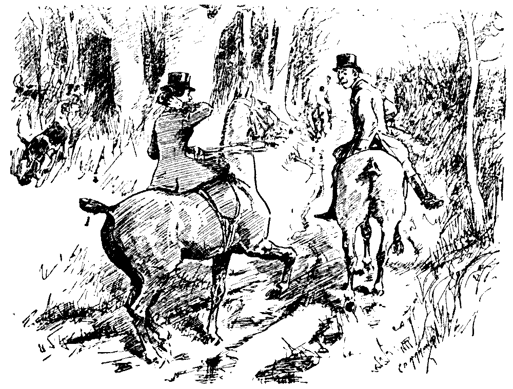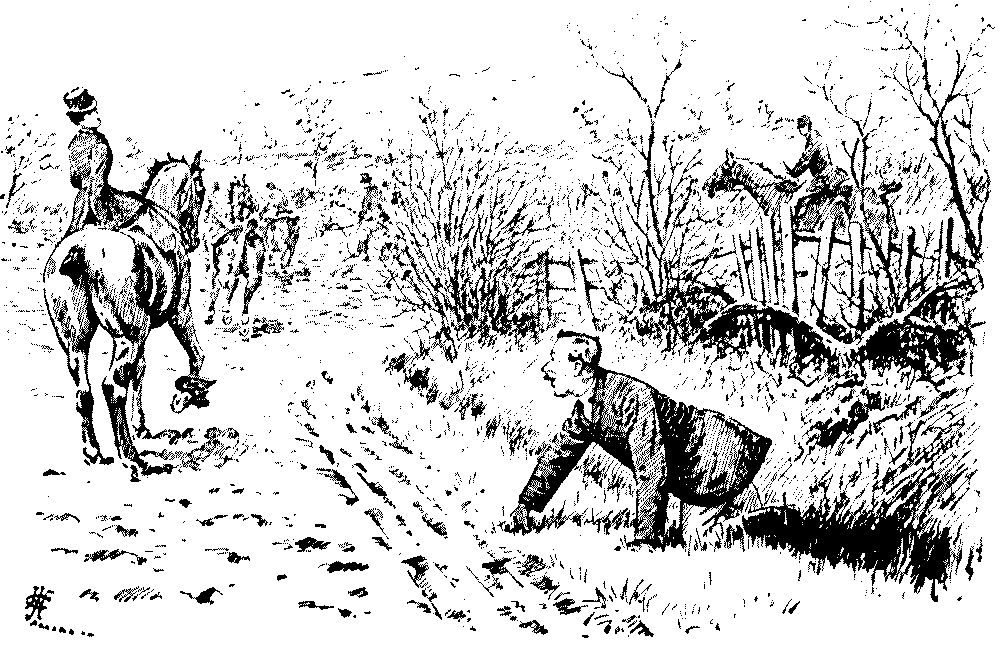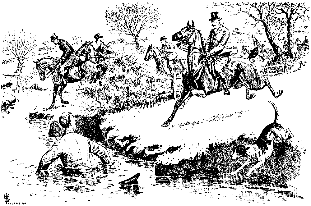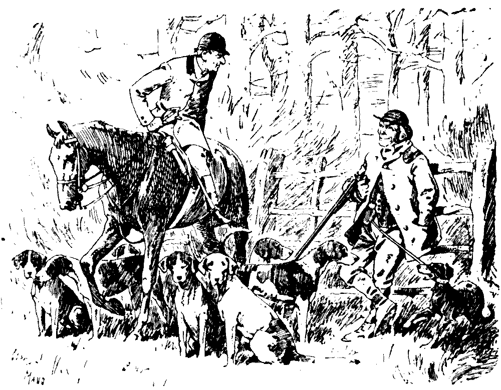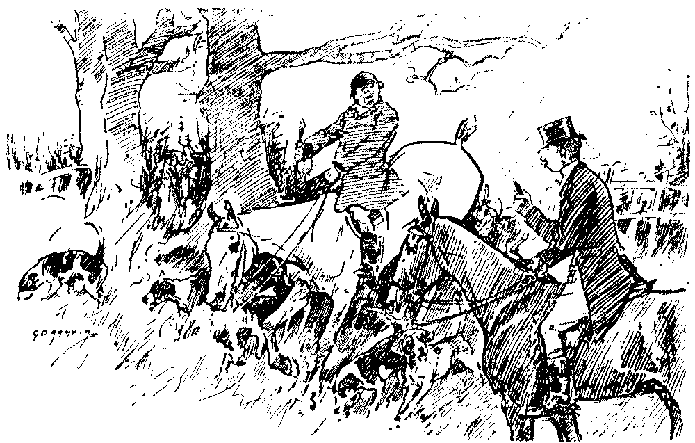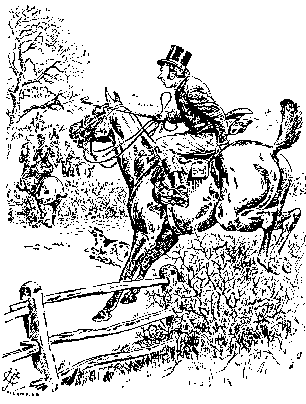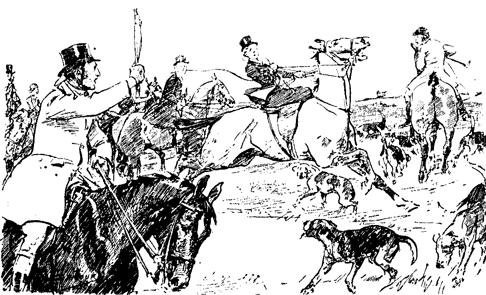 From his earliest days Mr. Punch has been an enthusiast for the Hunting Field. But in this he has only been the faithful recorder of the manners of his countrymen, as there is no sport more redolent of "Merrie England" than that of the Horse and Hound. At no time in Mr. Punch's history has he been without an artist who has specialised in the humours of the hunt. First it was the inimitable Leech, some of whose drawings find a place in the present collection, and then the mantle of the sporting artist would seem to have descended to feminine shoulders, as Miss Bowers (Mrs. Bowers-Edwards) wore it for some ten years after 1866. That lady is also represented in the present work, at pages 49 and 111. Later came Mr. G. H. Jalland, many of whose drawings we have chosen for inclusion here. Perhaps the most popular of his hunting jokes was that of the Frenchman exclaiming, "Stop ze chasse! I tomble, I faloff! Stop ze fox!!!" (see page 141). To-day, of course, it is Mr. G. D. Armour whose pencil is devoted chiefly to illustrating the humorous side of hunting; but now, as formerly, most of the eminent artists whose work lies usually in other fields, delight at times to find a subject associated with the hunt. Thus we are able to present examples of Mr. Cecil Aldin and Mr. Raven-Hill in sportive mood, while such celebrities of the past as Randolph Caldecott and Phil May are here drawn upon for the enriching of this, the first book of hunting humour compiled from the abundant chronicles of Mr. Punch.