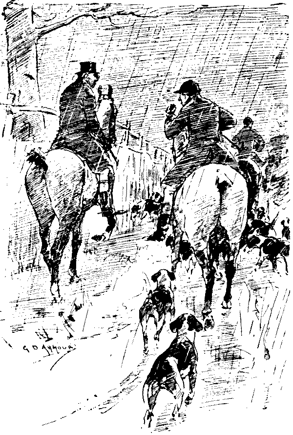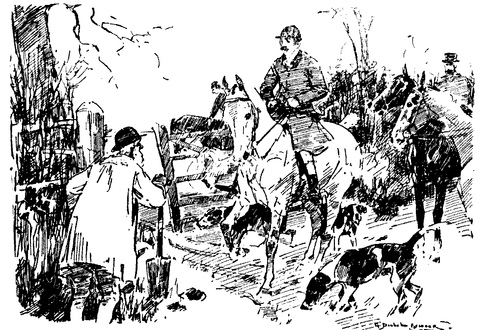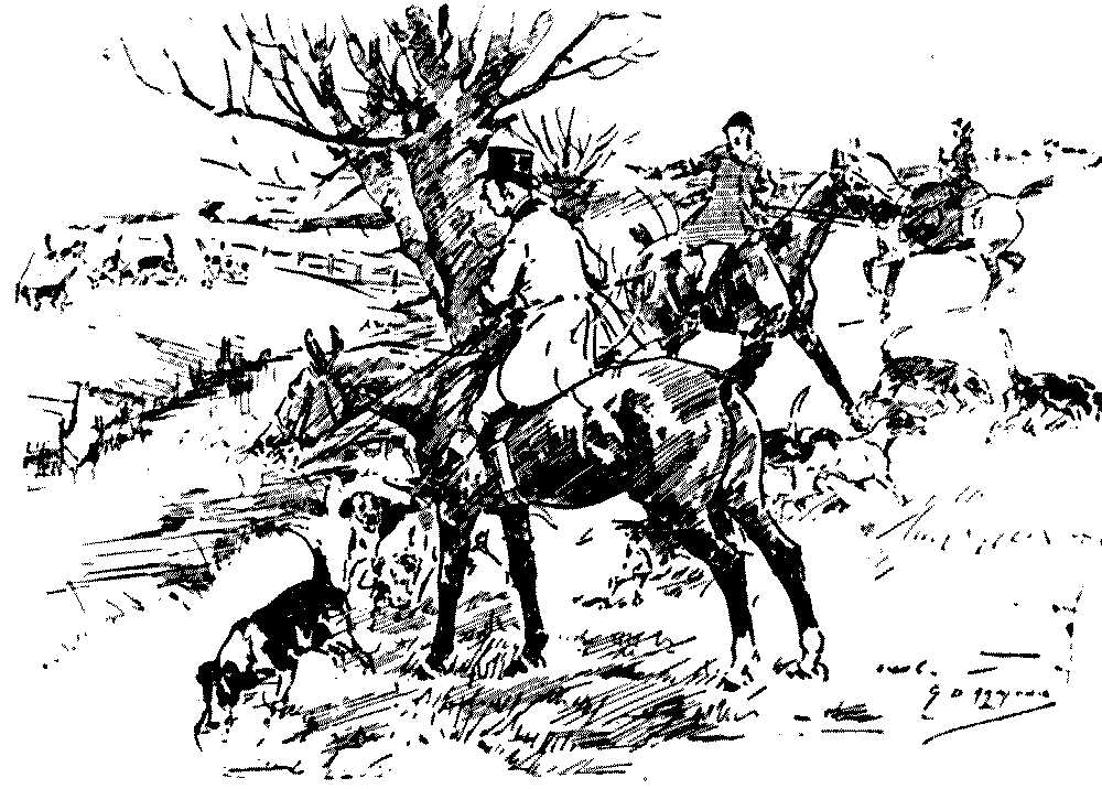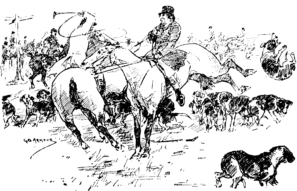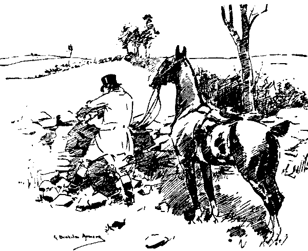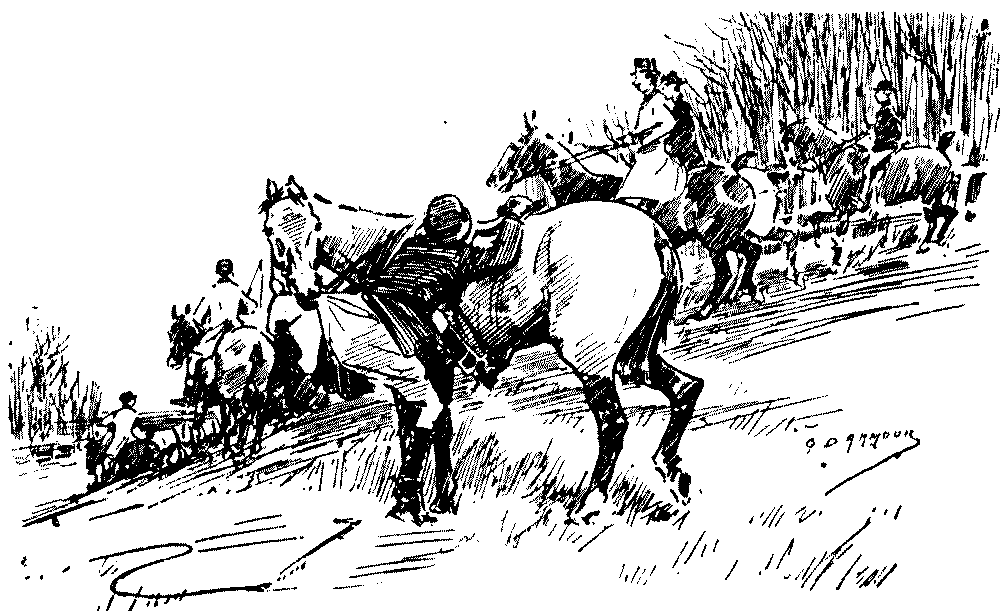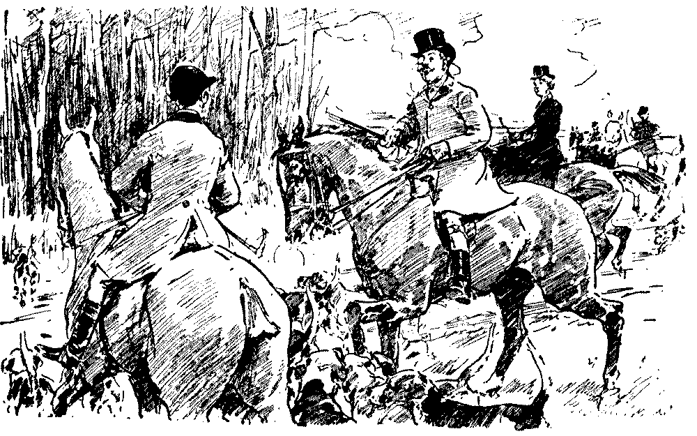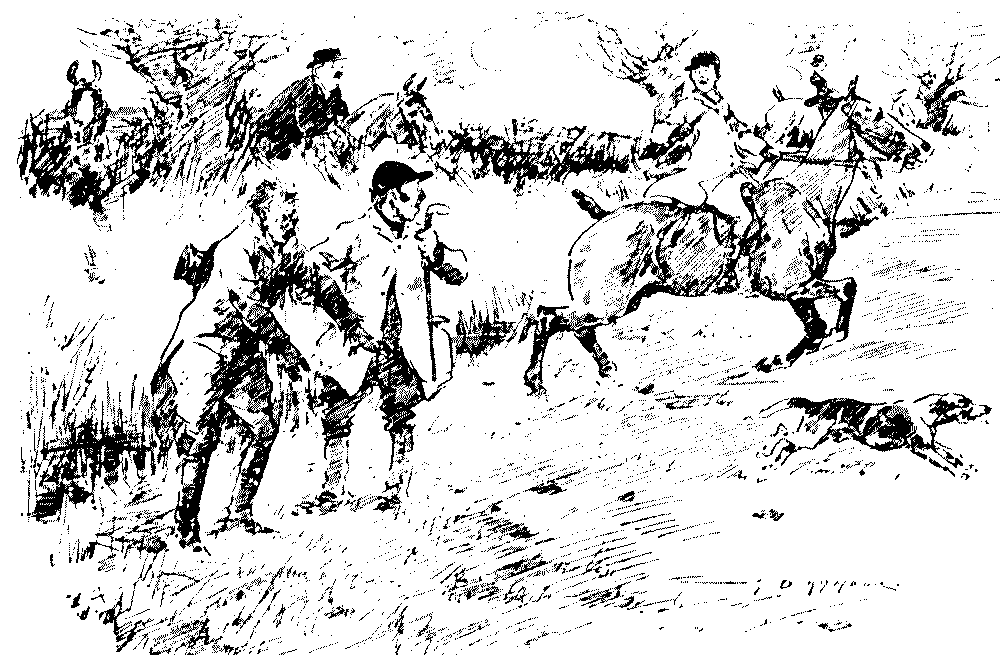 From his earliest days Mr. Punch has been an enthusiast for the Hunting Field. But in this he has only been the faithful recorder of the manners of his countrymen, as there is no sport more redolent of "Merrie England" than that of the Horse and Hound. At no time in Mr. Punch's history has he been without an artist who has specialised in the humours of the hunt. First it was the inimitable Leech, some of whose drawings find a place in the present collection, and then the mantle of the sporting artist would seem to have descended to feminine shoulders, as Miss Bowers (Mrs. Bowers-Edwards) wore it for some ten years after 1866. That lady is also represented in the present work, at pages 49 and 111. Later came Mr. G. H. Jalland, many of whose drawings we have chosen for inclusion here. Perhaps the most popular of his hunting jokes was that of the Frenchman exclaiming, "Stop ze chasse! I tomble, I faloff! Stop ze fox!!!" (see page 141). To-day, of course, it is Mr. G. D. Armour whose pencil is devoted chiefly to illustrating the humorous side of hunting; but now, as formerly, most of the eminent artists whose work lies usually in other fields, delight at times to find a subject associated with the hunt. Thus we are able to present examples of Mr. Cecil Aldin and Mr. Raven-Hill in sportive mood, while such celebrities of the past as Randolph Caldecott and Phil May are here drawn upon for the enriching of this, the first book of hunting humour compiled from the abundant chronicles of Mr. Punch.