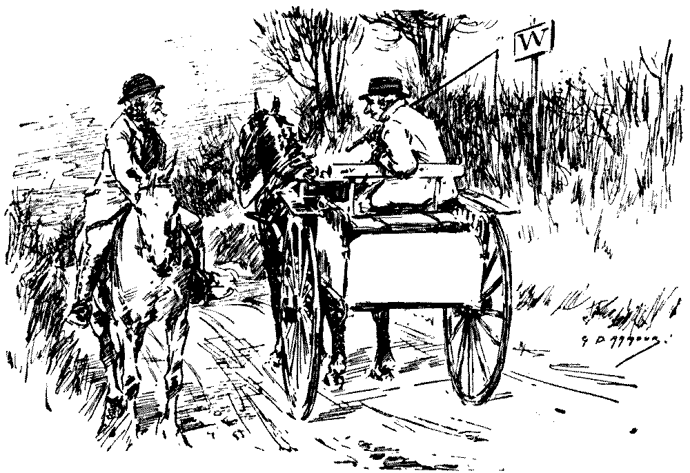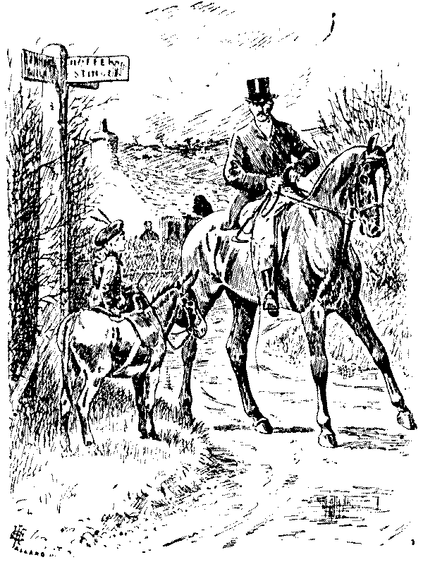 Awful predicament of young Fitz-Brown, who, having undertaken to see a young lady safely home after a day with the Seaborough Harriers, has lost his way, and has climbed up what he takes to be a sign-post.