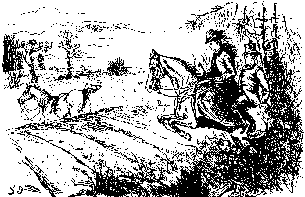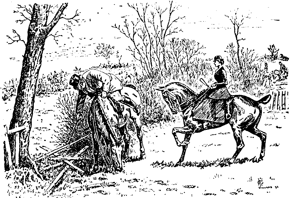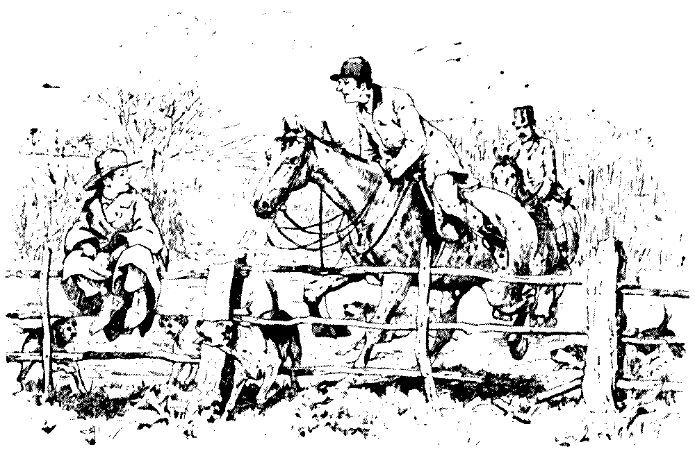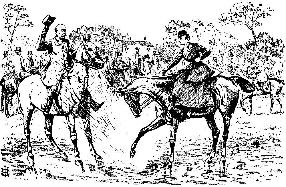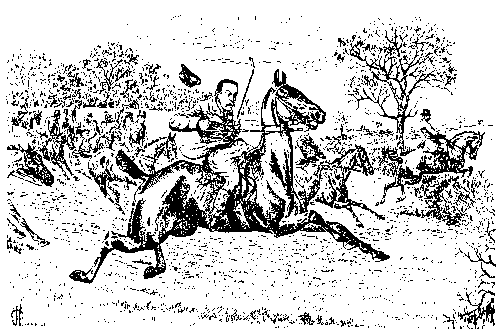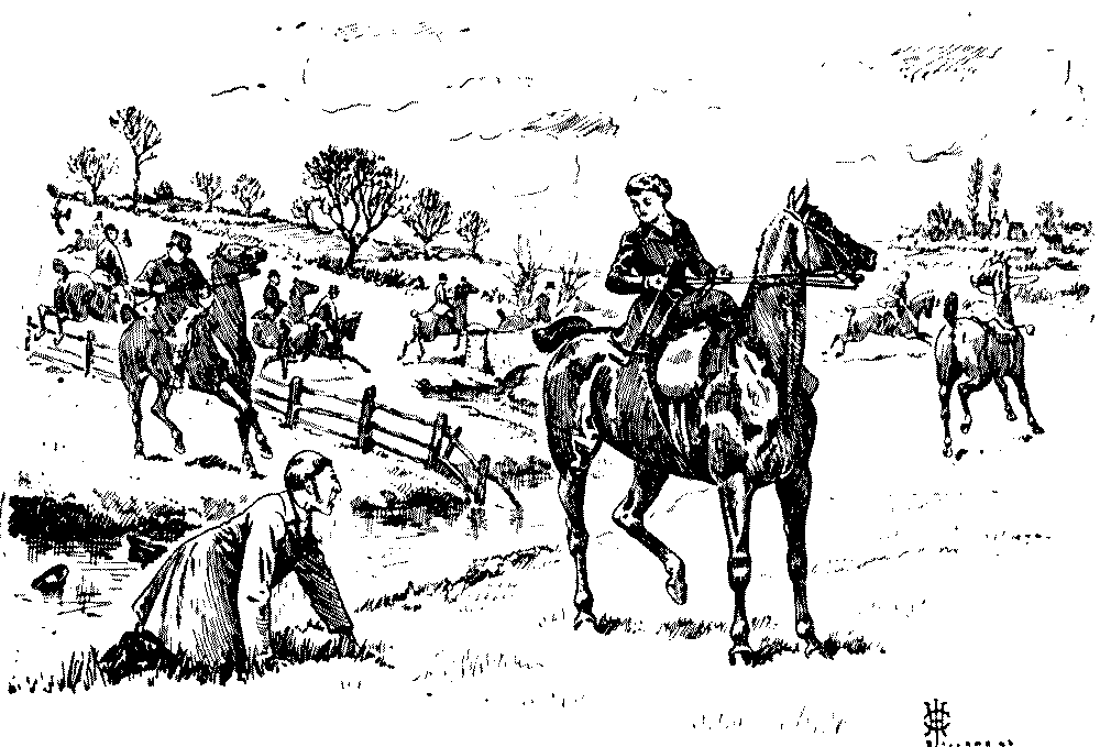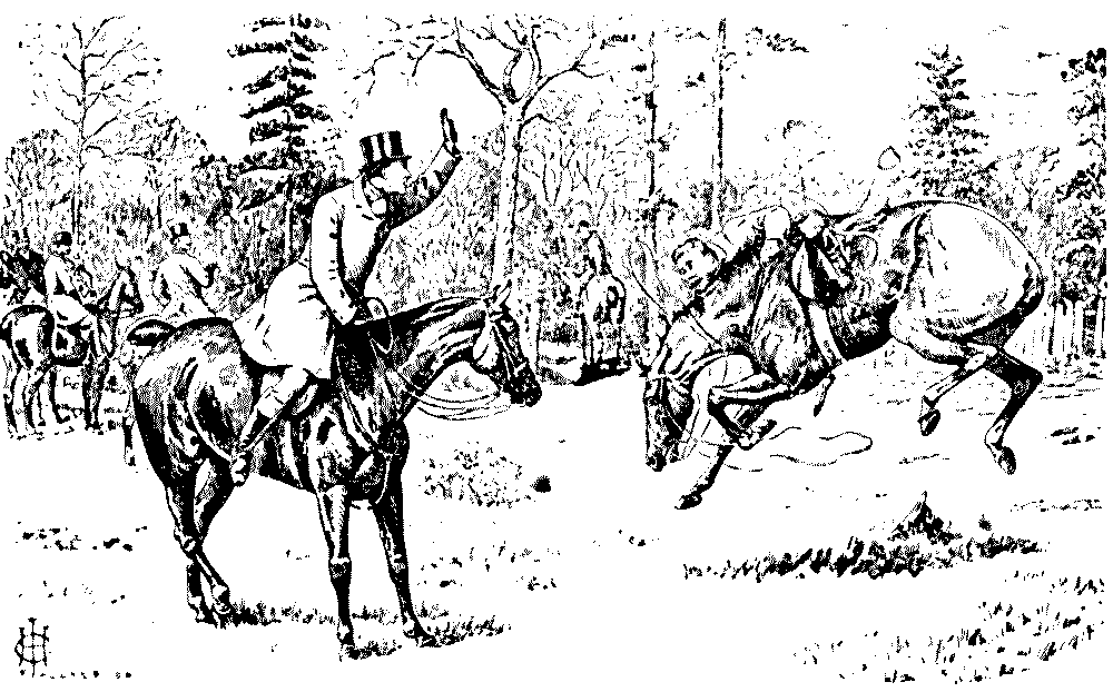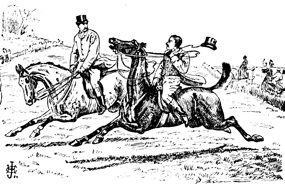Last week our Point to Point steeplechase came off. So did several of the riders: this merely par parenthèse. I offered to mark out the course, and, as I intended to escape the dread ordeal of riding by scratching my horse at the last moment, I thought it would be great fun to choose a very stiff, not to say bloodthirsty, line. Awful grumbling on the part of those unhappy ones who were to ride. Just as the bell rang for saddling, Captain Sproozer, ready dressed for the fray, came up to me with very long face, and said, "Beastly line this, you know, Phunker. I call it much too stiff."