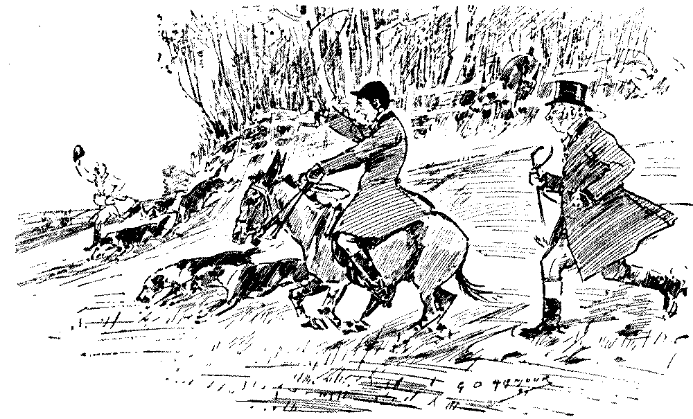 Monday.—Splendid gallop after non-subscriber. Spotted the quarry on good-looking chestnut, whilst we were drawing big covert. Edged my horse over in his direction, but non-subscriber very wary—think he must have known my face as "collector of tolls." Retired again to far side of spinney and disguised myself in pair of false whiskers, which I always keep for these occasions. Craftily sidled up, and finally got within speaking distance, under cover of the whiskers, which effectually masked my battery. "Beg pardon, sir," I began, lifting my hat, "but I don't think I have the pleasure of knowing your name as a subscri——" But he was off like a shot. Went away over a nice line of country, all grass, and a good sound take-off to most of the fences. Non-subscriber had got away with about a three lengths lead of me, and that interval was fairly maintained for the first mile and a half of the race. Then, felt most annoyed to see that my quarry somewhat gained on me as we left the pasture land and went across a holding piece of plough. Over a stiff post and rails, and on again, across some light fallow, towards a big dry ditch. The hunted one put his horse resolutely at it—must say he rode very straight, but what won't men do to avoid "parting?"—horse jumped short and disappeared from view together with his rider. Next moment I had also come a cropper at ditch, and rolled down on top of my prey. "Excuse me," I said, taking out my pocket-book and struggling to my knees in six inches of mud, "but when you rather abruptly started away from covertside, I was just about to remark that I did not think you were a subscriber, and that I should have much pleasure in taking the customary 'cap'—thank you." And he paid up quite meekly. We agreed, as we rode back together, in the direction in which we imagined hounds to be, that even if they had got away with a good fox, the field would not be likely to have had so smart a gallop as he and I had already enjoyed. Lost my day's hunting, of course.