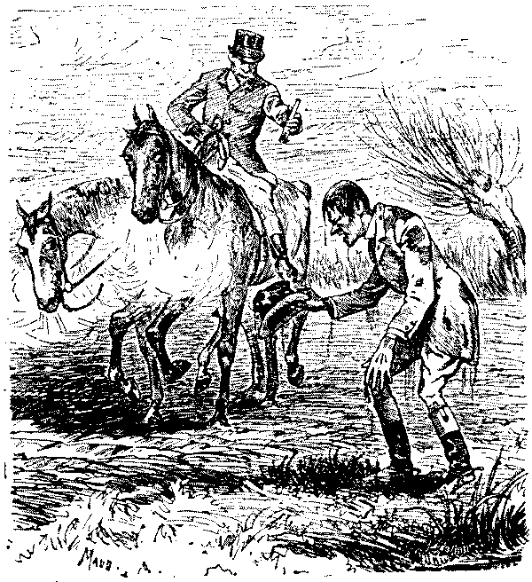 "So you shall, then!" cried a rasping voice, suddenly, from behind me. Sir Hercules[Pg 165] Blizzard was the speaker, an awful man with an awful temper. "So you shall. My idiot of a jockey broke his collar-bone trying to jump one of the fences on this confounded course of yours to-day, so, as I am without a rider, you shall ride my mare Dinah."