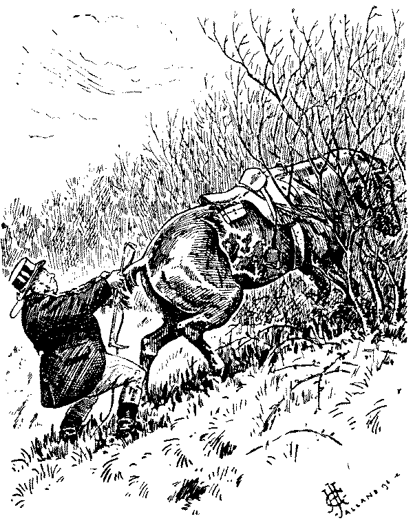 Short-sighted Party (thrown earlier, after weary tramp, thinks he sees mount on ploughed upland, and approaches bush coaxingly.) "Whoa, my beauty! Steady, my gal, steady then," &c.