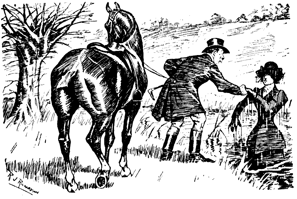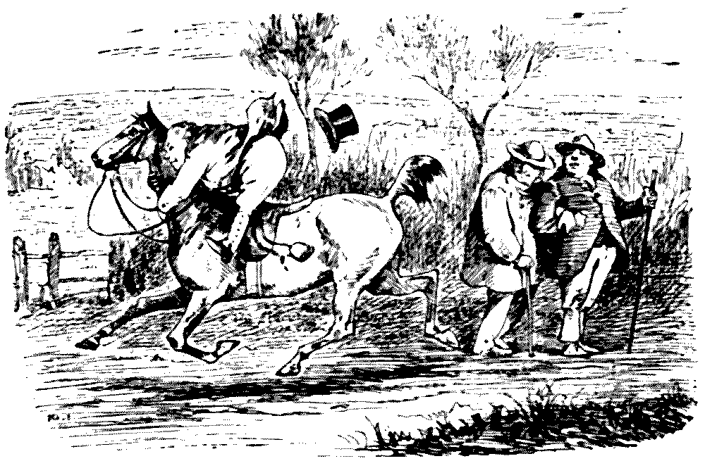 Tomlin (who has been mounted by friend.) "It's all very well to shout 'Loose your reins', but what the deuce am I to hang on to?"