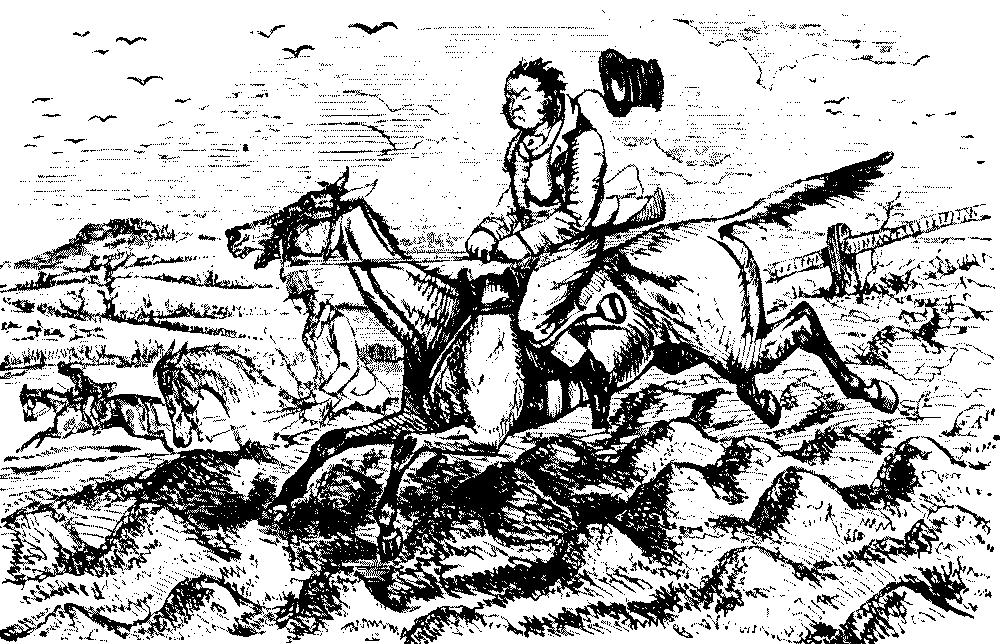 Galloping down the side of a field covered with mole-hills, on a weak-necked horse, with a snaffle bridle, one foot out of your stirrup, and a bit of mud in your eye!