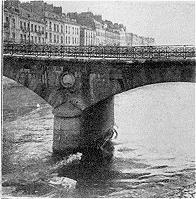 ![]() Après la chute du pont: seule la dernière pile émerge, tandis que les rails du tramway, les câbles électriques et les conduites d'eau relient toujours les deux rives.--Phot. Thuret. |