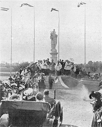Processionnellement, de la petite église on se rendit à la place où s'érige la statue du saint, au-dessus de laquelle flottaient, en ce dimanche de fête, des étendards tricolores. Les autos, à petite vitesse, suivaient, en longue théorie, au chant des hymnes et d'un cantique de circonstance, la foule des fidèles, les gymnastes de la localité, portant eux-mêmes sur un brancard, une statuette de saint Christophe. C'était un spectacle infiniment pittoresque et original.