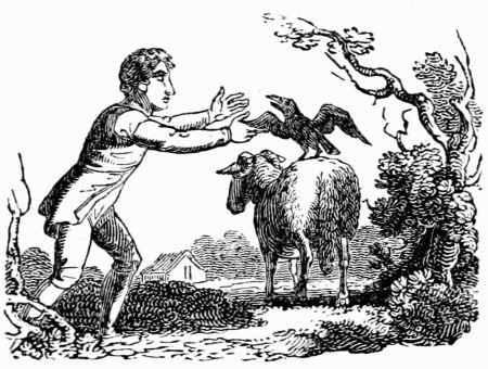 An Eagle flew down from the top of a high rock, and settled upon the back of a Lamb; and then instantly flying up into the air again, bore his bleating prize aloft in his pounces. A Crow, who sat upon an elm, and beheld this exploit, resolved to imitate it; so flying down upon the back of a Ram, and entangling his claws in the wool, he fell a chattering and attempting to fly; by which means he drew the observation of the Shepherd upon him, who finding his feet hampered in the fleece of the Ram, easily took him, and gave him to his boys for their sport and diversion.