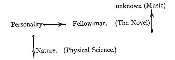 Now in this second train of thought I shall endeavor[10] to connect these phenomena with the principle of personality developed in the first train, and shall try to show that this science, music, and the novel, are flowerings-out of that principle in various directions; for instance, each man in this growth of personality feeling himself in direct and personal relations with physical nature (not in relations obscured by the vague intermediary, hamadryads and forms of the Greek system), a general desire to know the exact truth about nature arises; and this desire carried to a certain enthusiasm in the nature of given men—behold the man of science; a similar feeling of direct personal relation to the Unknown, acting similarly upon particular men,—behold the musician, and the ever-increasing tendency of the modern to worship God in terms of music; likewise, a similar feeling of direct personal relation to each individual member of humanity, high or low, rich or poor, acting similarly, gives us such a novel as the Mill on the Floss, for instance, when for a long time we find ourselves interested in two mere children—Tom and Maggie Tulliver—or such novels as those of Dickens and his fellow-host who have called upon our human relation to poor, unheroic people.