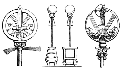 There were, however, varieties in the forms of the Assyrian standards other than those mentioned by Layard. In the annexed cut (Fig. 7) the one to the left is from a sculpture in the British Museum. The others are given on the authority of Botta.