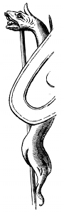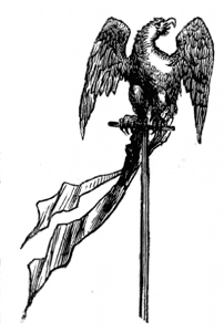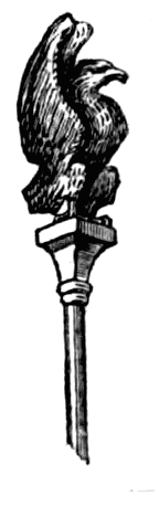 The Romans had various forms of standards, some composed entirely of fixed figures of different devices, including figures of animals. The eagle, according to Pliny, was the first and chief military ensign. In the second consulship of Caius Marius (B.C. 104) the eagle (Fig. 11) alone was used, but at a subsequent period some of the old emblems were resumed. These were the minotaur, the horse, and the wild boar; and on the Trajan Column we find as one of their standards the historic wolf (Fig. 12).