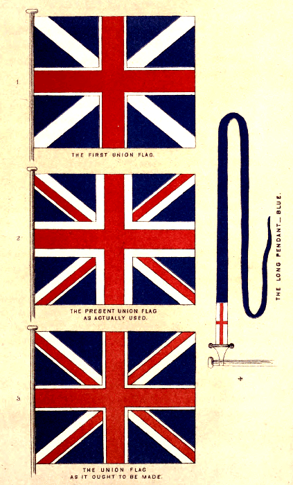 Yet how few of us know what the national colours are, what the Union is, what the Royal Standard is. Not to speak of civilians, are there many officers, in either the army or the navy, who, without a copy before them, could accurately construct or describe the flag of the nation under which they fight, or tell what its component parts represent? I doubt it. And, after all, they would not be so much without excuse, for even at the Horse Guards and the Admiralty, there is some confusion of ideas on the subject. I have before me "The Queen's Regulations and Orders for the Army," issued by the Commander-in-chief, in which flags which can be flown only on shore are confounded with flags which can be flown nowhere but on board ship. Yet the subject is really an interesting one, and, connected as it is with national history, it is deserving of a little study.