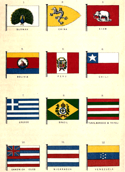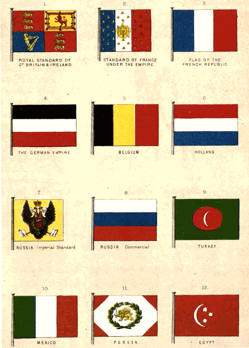 Flags are of many kinds, and they are put to many uses. They are the representatives of nations; they [pg 13] distinguish armies and fleets, and to insult a flag is to insult the nation whose ensign it is. We see in flags, says Carlyle, "the divine idea of duty, of heroic daring—in some instances of freedom and right." There are national flags, flags of departments, and personal flags; and as signals they are of the greatest value as a means of communication at sea.