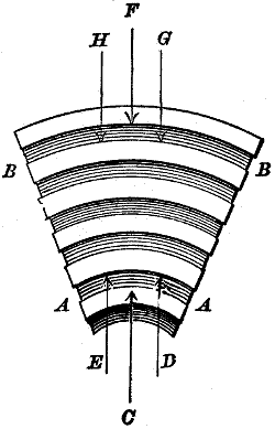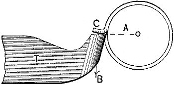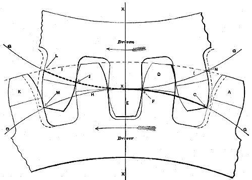 | Tracing the path of contact of tooth upon tooth in a pair of gear-wheels; definition of the “arc of approach;” definition of the “arc of recess;” demonstration that the flanks of the teeth on the driver or driving-wheel have contact with the faces of the driven wheel during the arc of approach, and with the flanks of the driven wheel during the arc of recess | 13 | ||