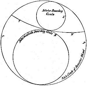 | Finding how many teeth will be in constant action, the diameter of the wheels, the pitch of the teeth, and the diameter of the rolling circle being given | 15 | ||