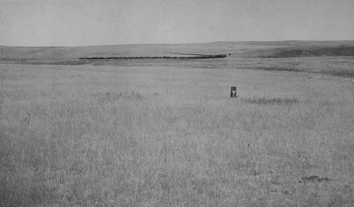Late in the afternoon clouds appeared in the northwest and the earth trembled with the resounding peals of thunder. The lightning played dangerously near, and then, like the artillery of a mighty battle, the storm broke loose and the rain fell in torrents, filling the draws and ravines, and overflowing the creeks, which ran for days after. All over the north country the drouth was broken and plant life began anew.
