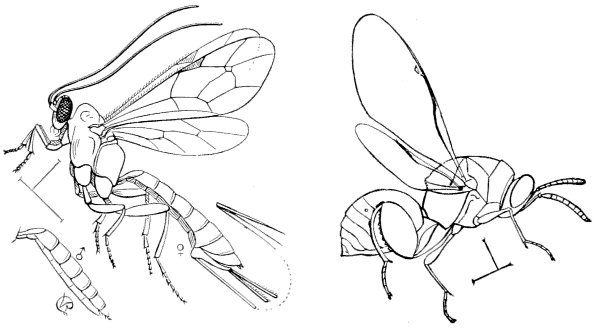 “The terebrantine Hymenoptera, or Piercers, are again divisible into two subsections: first, the Entomophaga, which are, likewise, with the exception of a few gall-makers, beneficial to man, and include the parasitic families, and the gall-flies; second, the Phytophaga, comprising the Horn-tails (Uroceridæ), and the Saw-flies (Tenthredinidæ), all of which are vegetable feeders in the larval[14] state, those of the first family boring into trees, and those of the second either feeding externally on leaves or inclosed in galls. They are at once distinguished from the other Hymenoptera by the larvæ having true legs, which, however, in the case of the Horn-tails, are very small and exarticulate. The larvæ of many Saw-flies have, besides, prolegs, which are, however, always distinguishable from those of Lepidopterous larvæ by being more numerous and by having no hooks.