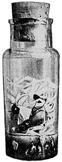 Spiders and mites thus collected may be transferred to alcohol. Dr. Marx,[130] who has had a very considerable experience in the preservation of spiders, recommends the use of the following mixture: Glycerin and Wickersheim's fluid, 1½ ounces of each, and distilled water 3 ounces, the whole to be shaken and thoroughly mixed and added to 30 ounces of 95 per cent alcohol. Alcohol which has previously been used for preserving spiders, and which has therefore dissolved some of the fatty matters from the specimens, he prefers to pure alcohol, using with this, however, somewhat less of the distilled water. The liquid thus composed answers all demands and keeps the specimens flexible and preserves their coloring. Should the stopper become loose and the liquid evaporate, there is always sufficient liquid, water or glycerine, left in the vial to keep the specimens from drying and thus save them from destruction. Dr. Marx also prefers to use cork stoppers rather than the rubber stoppers recommended for other alcoholic material. His objection to the rubber stopper is that, in a collection in which the specimens are often used and the stoppers are frequently removed, he finds that small particles of the rubber stopper come off and settle upon the specimens as a white dust, which it is difficult to remove. This objection applies only to a poor quality of rubber, and in all other respects the rubber is much to be preferred. The colors of spiders are apt to fade somewhat if exposed to light, and the collection should therefore be kept in closed boxes or in the dark.