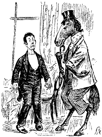 Saturday.—Very much worse. Awful cough. Sit close to fire wrapped in thick dressing-gown. Jones looks in. "Hullo, old man," he says, "what's wrong? Seedy?" I choke out some answer. "Why don't you send for the doctor?" In my indignation nearly burst my head with coughing. At last show him Dictionary, and write on scrap of paper, "Can you suggest some complaint like mine beginning with A or B, or C up to Ch?" Impetuous fellow, Jones. Starts off wildly—"Influenza, Pneumonia, Pleurisy, Diphtheria, Sore Throat, Inflammation of the Lungs——" Then I manage to stop him, and to gasp, "Up to C." "No difficulty about that," says he. "Cold. Cough——" I shake my head feebly. "Well, then, Bronchitis." Of course. The very thing. Look it out. "Bronchitis, from Greek"—blow the derivation!—"inflammation of the membrane of the bronchia. This serious disease requires skilled attention. Keep the patient warm, and send at once for a medical man." What a miserable swindle, when I hoped to save all doctor's fees! Was warm before. Simply boiling with indignation now. Pass the book to Jones in speechless disgust. "Quite right too," he remarks; "just what I said. Capital book! I'll send the doctor as I go home." And so he does, in spite of my protests. Doctor comes and lays his head on my chest. Then he says, cheerfully, "Only a little cough. You'll be all right to-morrow. What's that you say? Bronchitis? Bosh!"