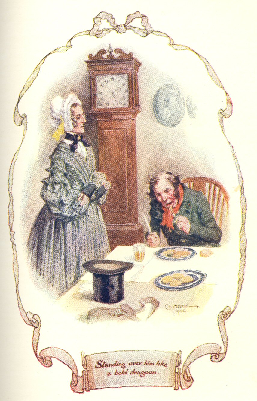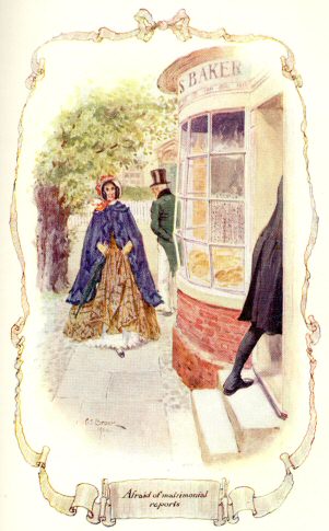 It was impossible to live a month at Cranford and not know the daily habits of each resident; and long before my visit was ended I knew much concerning the whole Brown trio. There was nothing new to be discovered respecting their poverty; for they had spoken simply and openly about that from the very first. They made no mystery of the necessity for their being economical. All that remained to be discovered was the Captain’s infinite kindness of heart, and the various modes in which, unconsciously to himself, he manifested it. Some little anecdotes were talked about for some time after they occurred. As we did not read much, and as all the ladies were pretty well suited with servants, there was a dearth of subjects for conversation. We therefore discussed the circumstance of the Captain taking a poor old woman’s dinner out of her hands one very slippery Sunday. He had met her returning from the bakehouse as he came from church, and noticed her precarious footing; and, with the grave dignity with which he did everything, he relieved her of her burden, and steered along the street by her side, carrying her baked mutton and potatoes safely home. This was thought very eccentric; and it was rather expected that he would pay a round of calls, on the Monday morning, to explain and apologise to the Cranford sense of propriety: but he did no such thing: and then it was decided that he was ashamed, and was keeping out of sight. In a kindly pity for him, we began to say, “After all, the Sunday morning’s occurrence showed great goodness of heart,” and it was resolved that he should be comforted on his next appearance amongst us; but, lo! he came down upon us, untouched by any sense of shame, speaking loud and bass as ever, his head thrown back, his wig as jaunty and well-curled as usual, and we were obliged to conclude he had forgotten all about Sunday.