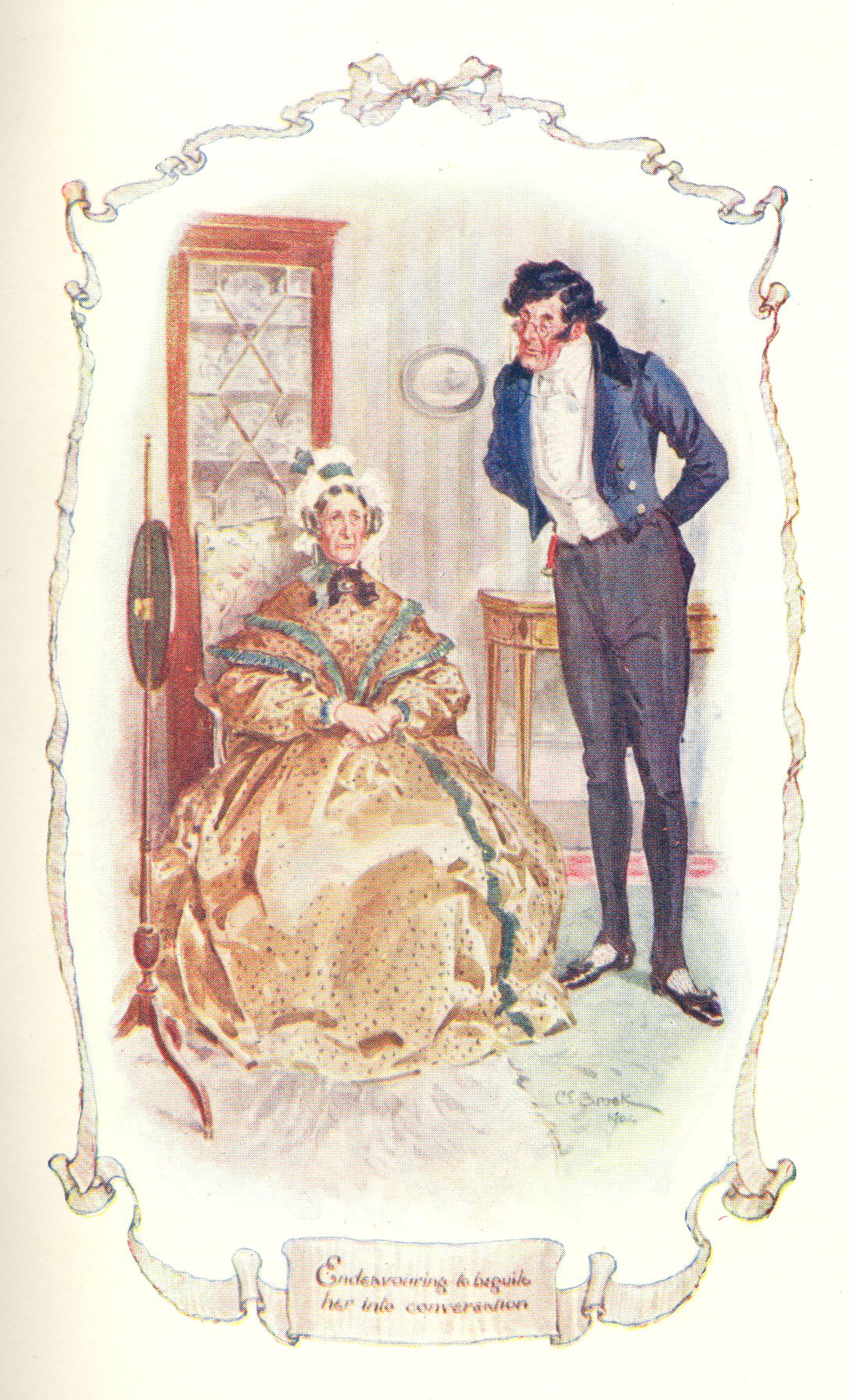 “The Honourable Mrs Jamieson has only just quitted me; and, in the course of conversation, she communicated to me the intelligence that she had yesterday received a call from her revered husband’s quondam friend, Lord Mauleverer. You will not easily conjecture what brought his lordship within the precincts of our little town. It was to see Captain Brown, with whom, it appears, his lordship was acquainted in the ‘plumed wars,’ and who had the privilege of averting destruction from his lordship’s head when some great peril was impending over it, off the misnomered Cape of Good Hope. You know our friend the Honourable Mrs Jamieson’s deficiency in the spirit of innocent curiosity, and you will therefore not be so much surprised when I tell you she was quite unable to disclose to me the exact nature of the peril in question. I was anxious, I confess, to ascertain in what manner Captain Brown, with his limited establishment, could receive so distinguished a guest; and I discovered that his lordship retired to rest, and, let us hope, to refreshing slumbers, at the Angel Hotel; but shared the Brunonian meals during the two days that he honoured Cranford with his august presence. Mrs Johnson, our civil butcher’s wife, informs me that Miss Jessie purchased a leg of lamb; but, besides this, I can hear of no preparation whatever to give a suitable reception to so distinguished a visitor. Perhaps they entertained him with ‘the feast of reason and the flow of soul’; and to us, who are acquainted with Captain Brown’s sad want of relish for ‘the pure wells of English undefiled,’ it may be matter for congratulation that he has had the opportunity of improving his taste by holding converse with an elegant and refined member of the British aristocracy. But from some mundane failings who is altogether free?”