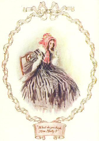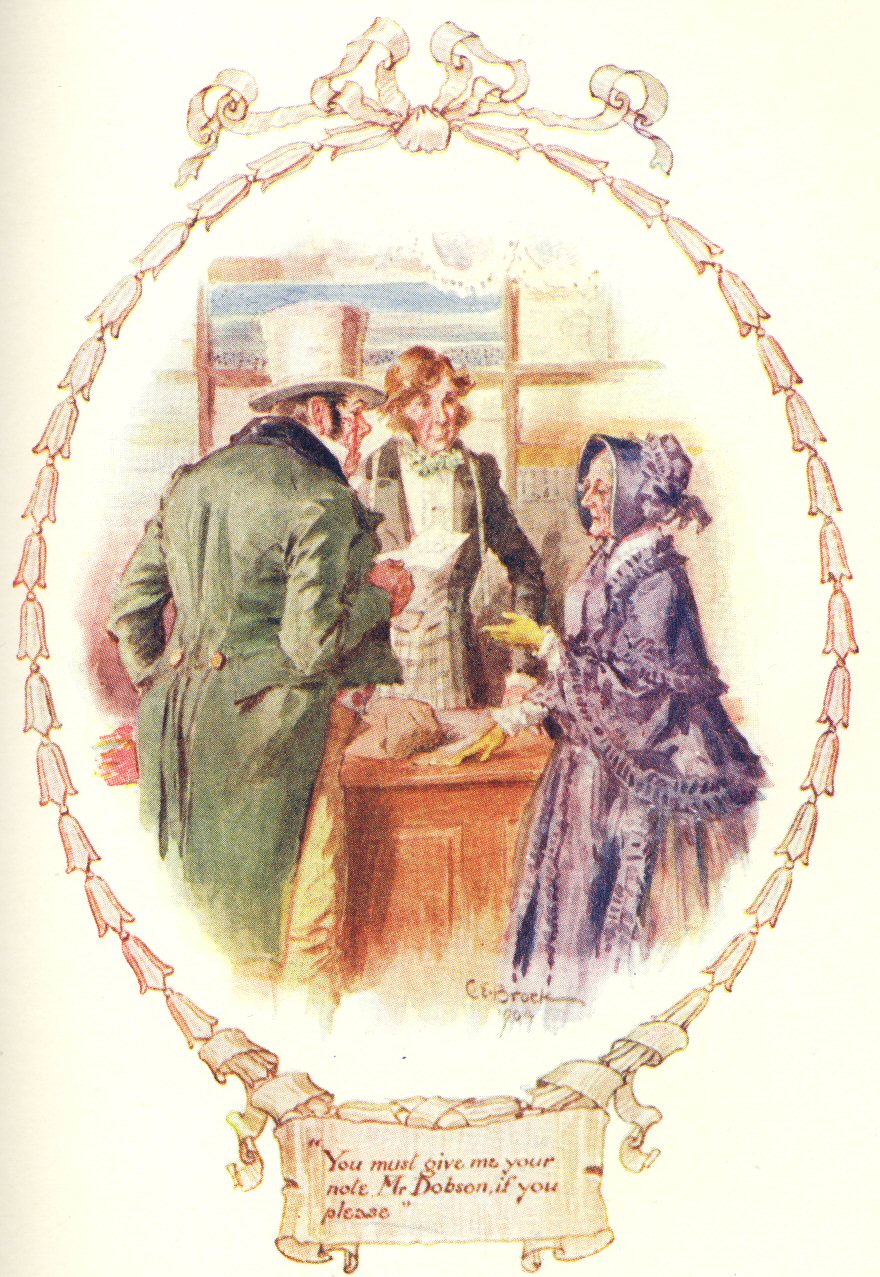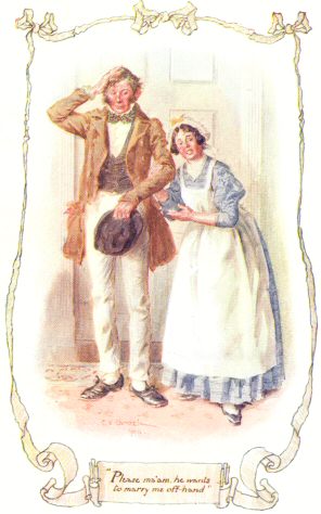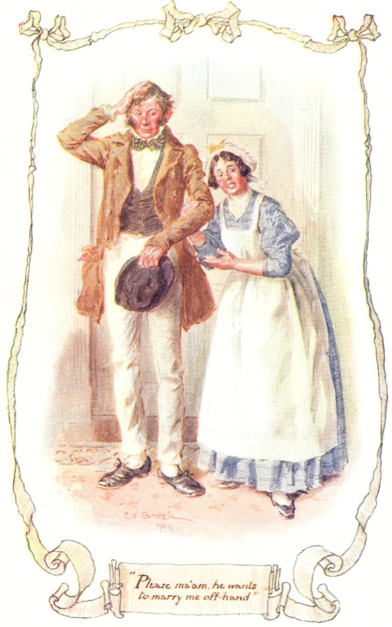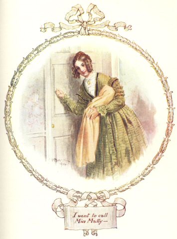 “And please, ma’am, he wants to marry me off-hand. And please, ma’am, we want to take a lodger—just one quiet lodger, to make our two ends meet; and we’d take any house conformable; and, oh dear Miss Matty, if I may be so bold, would you have any objections to lodging with us? Jem wants it as much as I do.” [To Jem ]—“You great oaf! why can’t you back me!—But he does want it all the same, very bad—don’t you, Jem?—only, you see, he’s dazed at being called on to speak before quality.”