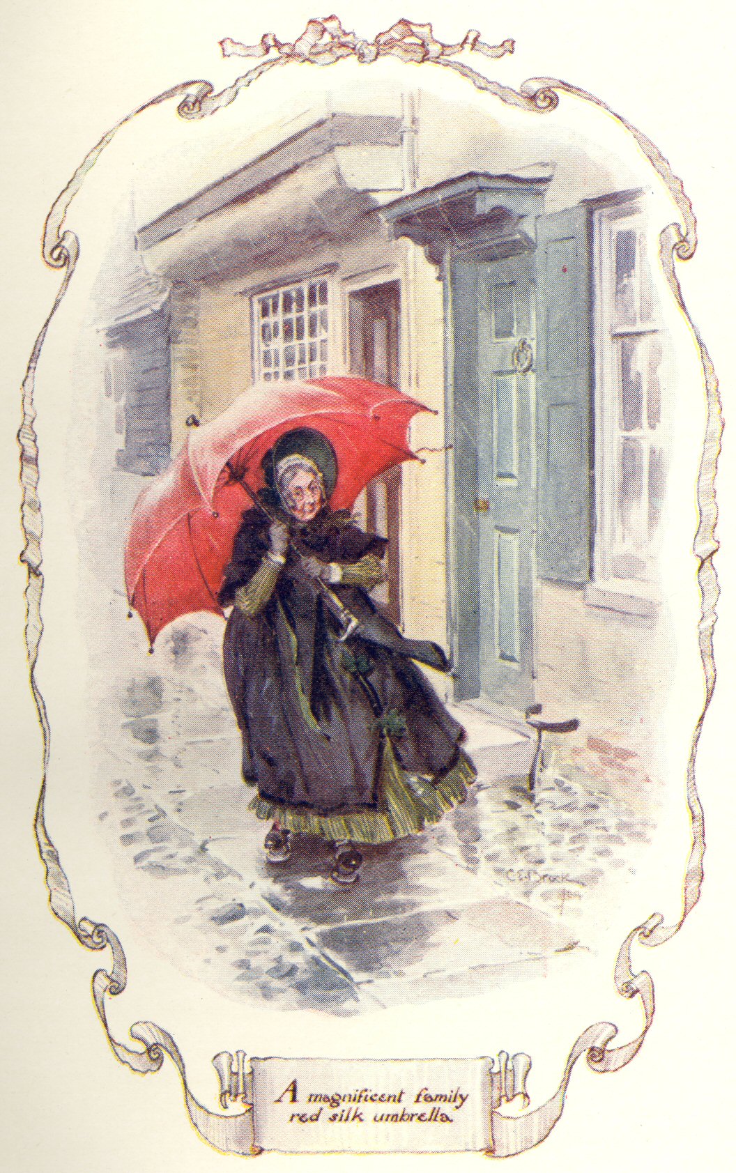 I can testify to a magnificent family red silk umbrella, under which a gentle little spinster, left alone of many brothers and sisters, used to patter to church on rainy days. Have you any red silk umbrellas in London? We had a tradition of the first that had ever been seen in Cranford; and the little boys mobbed it, and called it “a stick in petticoats.” It might have been the very red silk one I have described, held by a strong father over a troop of little ones; the poor little lady—the survivor of all—could scarcely carry it.