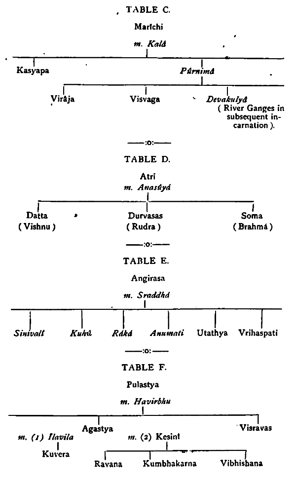Those who did not reach the Manasic state, in the last Kalpa were no acquisitions to the higher planes of Brahmânda, which stand over the three mortal planes, where all experience is to be gathered. Those who developed the Manasic state were gathered to the third of the higher planes, Jana Loka, because further development was possible, nay it was a necessity, in the Trilokî that was to come. But there were others, who did not quite reach the Manasic state, but they were still on the way to acquire such state, and in fact they acquired the human form. They were also preserved to carry out a certain purpose in the life evolution of the coming Kalpa which will be shortly mentioned. How they were preserved, the Purânas do not speak of. They became the Pitris of the present Kalpa. The Pitris reached different states of development and were therefore classed under seven heads. Some of them had developed the fire in them and some were without the fire. "Agnishvatta, Barhishad, Sōmapa, and Ajyapa are Pitris with fire; the others are without fire. They were all wedded to Svadha, the daughter of Daksha." IV-1-III.