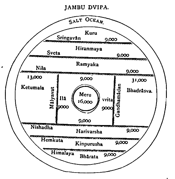 Bhûr Loka is His loins, Bhuvar Loka His navel, Svar Loka His breast, Mahar Loka His throat, Jana Loka His mouth, Tapas Loka His forehead, and Satya Loka is the head of the thousand-headed Virât Purusha. Indra and other Usra Devas (the world Usra meaning, literally, a ray of light) are his hands.