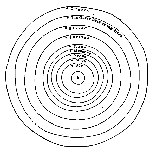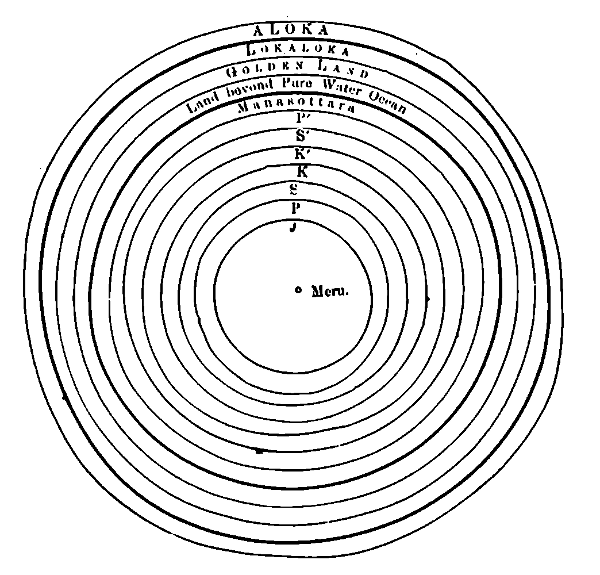Prakriti changes its forms and states. The body disintegrates into particles, particles into molecules, and molecules into atoms. Solid becomes liquid, liquid becomes gaseous and gaseous becomes ultra-gaseous. Life manifests itself through the endless varieties of Prakriti and becomes manifold in its manifestations. The hard mineral matter does not admit the mineral life to be expressed in any other way than by a fixed form. The more plastic vegetable matter shews vegetable life in all the activities of life and growth. Subtler matter appears in the animals and makes the sensing of the object world possible. Even sublter matter becomes the basis of brain activities. The Prâkritic basis of the mind is two-fold in its character Ahankâra and Mahat. When the mind is capable of thinking only from the standpoint of one life and one birth only, it is limited by Ahankâra matter. When that limit is overcome, mind is on the plane of Mahat. Individuality is not lost, but the individual has consciousness of all births, i.e. consciousness on the plane of the universe. Such consciousness does not normally exist in Trilokî. When a man becomes normally conscious on the plane of Mahat, he is carried to Mahar Loka and becomes a Rishi. Bhrigu is such a Rishi. The acquirement of such consciousness is the object of life evolution in our solar system. When the solar system is destroyed, it is the Manasic consciousness that alone survives. The three Lokas — Bhûr, Bhuvar and Svar are destroyed, The Prâkritic forms and states of these three Lokas become destroyed and the different states of consciousness corresponding to those forms and states finally disappear. The harvest of Manasic evolution, which is the only harvest reaped by means of one solar system is stored in Mahar Loka. But when the three lower Lokas are destroyed, the flames of dissolution reach even Mahar Loka and all the gains of a Kalpa's evolution are transferred to the higher plane of Jana Loka. This is therefore the highest plane of our consciousness. The highest evolved beings of the previous solar system could not after Pralaya go beyond Jana Loka, and their consciousness was the consciousness of Jana Loka. When our earth was formed and when they came down in time for further evolution, they brought down their highest consciousness with them as a possibility, for it was obscured in their entrance to Trilokî. As the soul gathers spiritual strength in Svarga Loka after death, so the disembodied soul after Prayala gathers spiritual strength in Jana Loka or the Loka of Kumâras. "When the three Lokas are consumed by fire from the mouth of Sankarshana, afflicted by the heat, Bhrigu and others go to Jana Loka" III-II-XXX. The Lord of Yoga goes by means of Sushumna through the radiant path in his subtle body and at last reaches Mahar Loka, where Bhrigu and other Rishis who live for one Kalpa remain. "Then seeing the Trilokî consumed by fire from the mouth of Ananta he goes towards that supreme abode, which is adorned by the chariots of great Siddhas, and which lasts for the whole life period of Brahmâ." (II-2-XXVI).