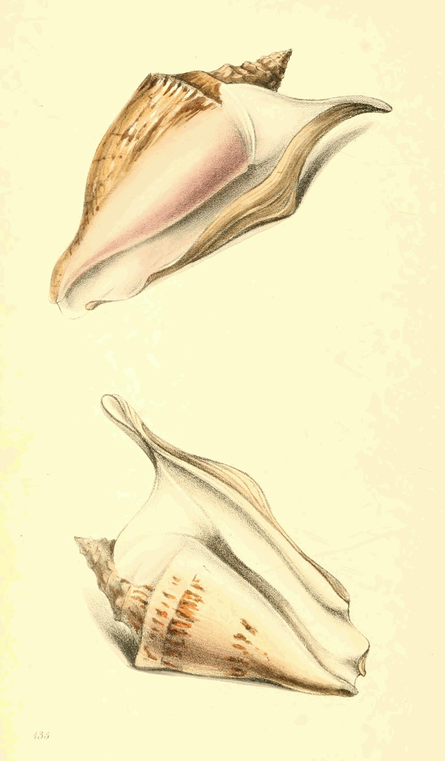 | — 134. | Strombus exustus, described by Lamarck (Syst. 7. p. 211) under the name of S. Papilio. The first of these names, however, has the right of priority. (See Mus. Cal. 1797.) The figures of Martini, tom. 3. tab. 8. f. 825, 826, clearly represent this species; although Lamarck has quoted them for S. lentiginosus. |