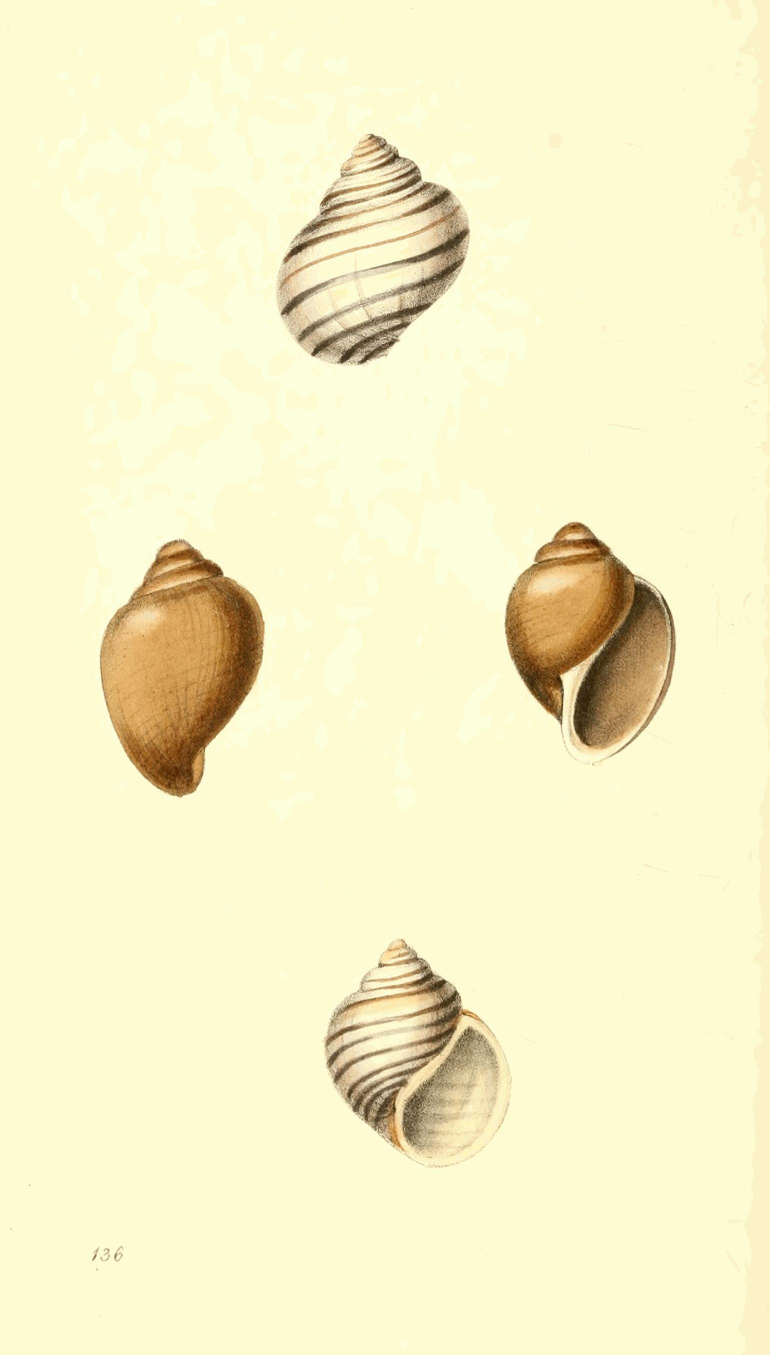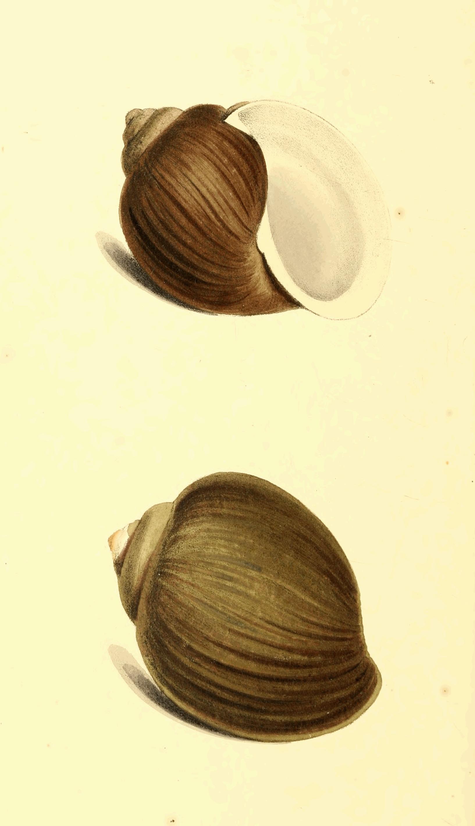 The shell generally known as the Ach. virginea (Bulla virginea Lin.) is so common, that few collectors do not possess it. The varieties, however, of this species are rare, and differ so remarkably in their colouring, as to require illustration. Several kindred species of this family I have already described; and on the same principle of establishing specific distinctions from formation instead of colour, I shall now endeavour to point out those characters which are common, more or less, to all the varieties of this species, and which distinguish it from its allies. A. virginea may be known by the comparative shortness of the basal whorl, which in general is broader than high; the margin of the outer lip is entire, and sloping in an oblique direction; the aperture is wide, and nearly round; the lower part of the columella takes a concave direction, and between its base and that of the outer lip is a very deep notch. The basal whorl is so broad that the shell, if placed on a table with its mouth downwards, will remain erect.