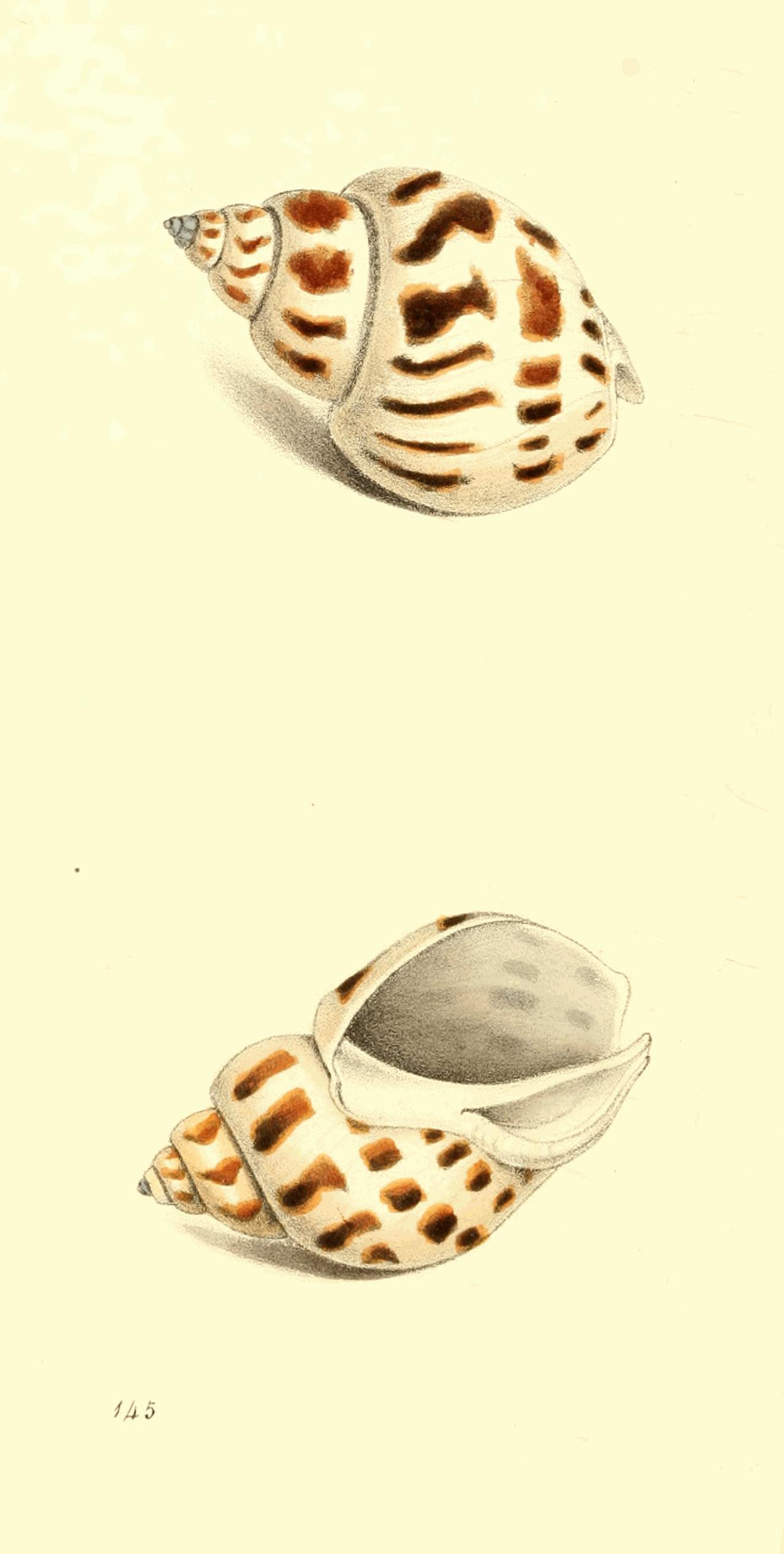 Shell fulvous or brown, with 2 interrupted white bands; spire short, elevated, conic, spotted, volutions concave with subgranulated striæ; base granulated, white.
