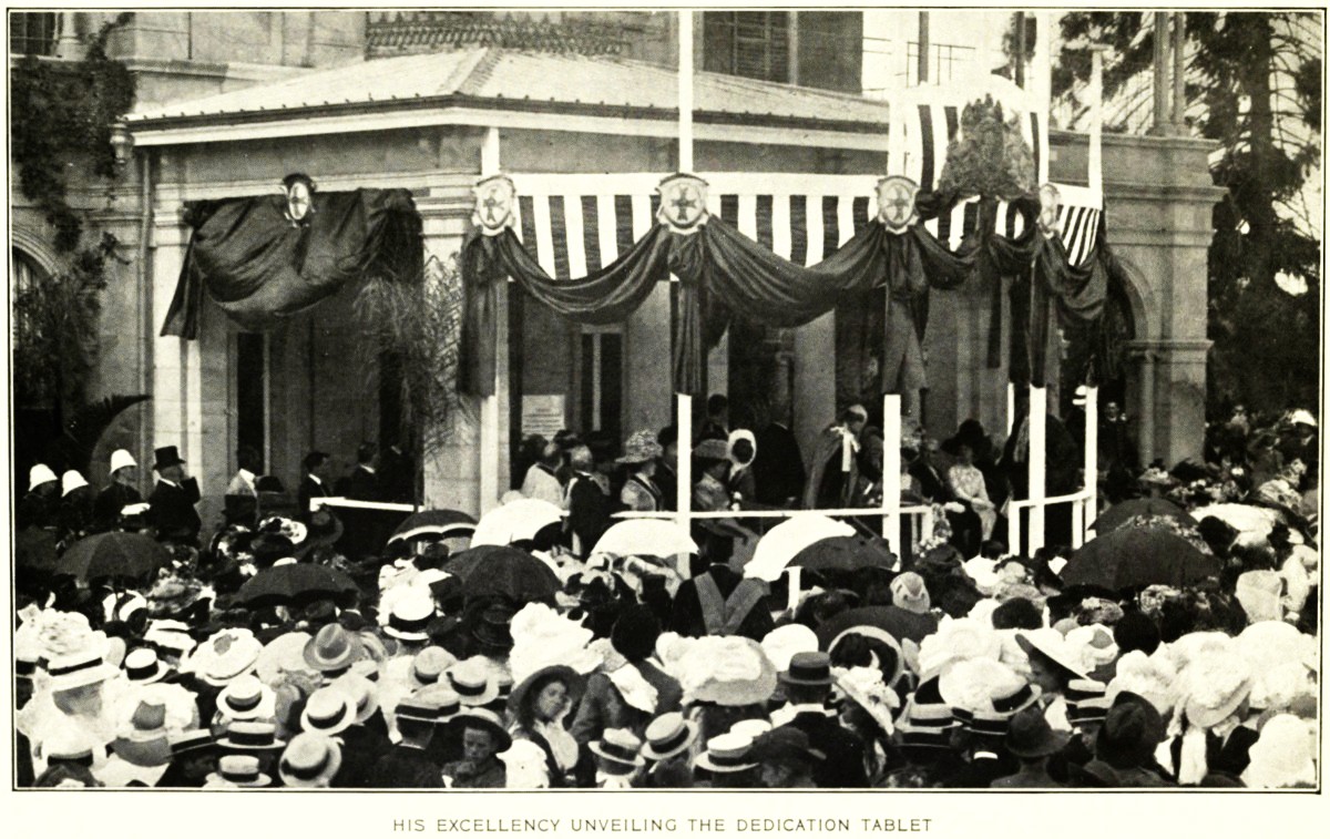 Never before in its history had Government House been the scene of a gathering so unique. The Premier struck the keynote of the whole proceedings, when he said that they were met "to erect this white stone, as it were, to mark this point in our national progress." He was alluding to the marble tablet, which had been affixed to the wall near the main entrance, recording the dedication of the building to its new purposes. Also, he declared the democratic foundation of the institution in the significant sentence: "In very truth it may be said that the Queensland University is of the people, and I trust that the Senate, when they start to manage this institution, will remember that it is also to be for the people."