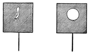 The tendency of soap-films to assume smaller forms may be directly demonstrated by a method of Van der Mensbrugghe. If we dip a square wire frame to which[Pg 12] a handle is attached into a solution of soap and water, we shall obtain on the frame a beautiful, plane film of soap-suds. (Fig. 4.) On this we lay a thread having its two ends tied together. If, now, we puncture the part enclosed by the thread, we shall obtain a soap-film having a circular hole in it, whose circumference is the thread. The remainder of the film decreasing in area as much as it can, the hole assumes the largest area that it can. But the figure of largest area, with a given periphery, is the circle.
