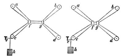 The connexion of the two above-mentioned paragraphs with the principle of least superficial area may be shown by a yet simpler example. Picture to yourselves four fixed pulleys, a, b, c, d, and two movable[Pg 13] rings f, g (Fig. 5); about the pulleys and through the rings imagine a smooth cord passed, fastened at one extremity to a nail e, and loaded at the other with a weight h. Now this weight always tends to sink, or, what is the same thing, always tends to make the portion of the string e h as long as possible, and consequently the remainder of the string, wound round the pulleys, as short as possible. The strings must remain connected with the pulleys, and on account of the rings also with each other. The conditions of the case, accordingly, are similar to those of the liquid figures discussed. The result also is a similar one. When, as in the right hand figure of the cut, four pairs of strings meet, a different configuration must be established. The consequence of the endeavor of the string to shorten itself is that the rings separate from each other, and that now at all points only three pairs of strings meet, every two at equal angles of one hundred and twenty degrees. As a fact, by this arrangement the greatest possible shortening of the string is attained; as can be easily proved by geometry.