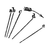 The shell or concha of the ear, a in the annexed diagram, conducts the sound into the curved auditory passage b, which is terminated by a thin membrane, the so-called tympanic membrane, e. This membrane is set in motion by the sound, and in its turn sets in motion a series of little bones of very peculiar formation, c. At the end of all is the labyrinth d. The labyrinth consists of a group of cavities filled with a liquid, in which the innumerable fibres of the nerve of hearing are imbedded. By the vibration of the chain of bones c, the liquid of the labyrinth is shaken, and the auditory nerve excited. Here the process of hearing[Pg 19] begins. So much is certain. But the details of the process are one and all unanswered questions.