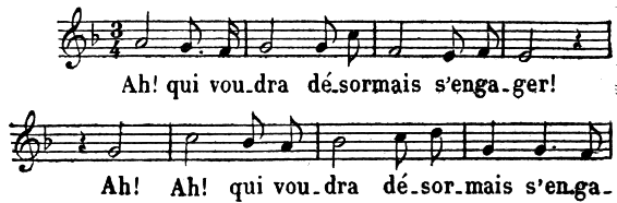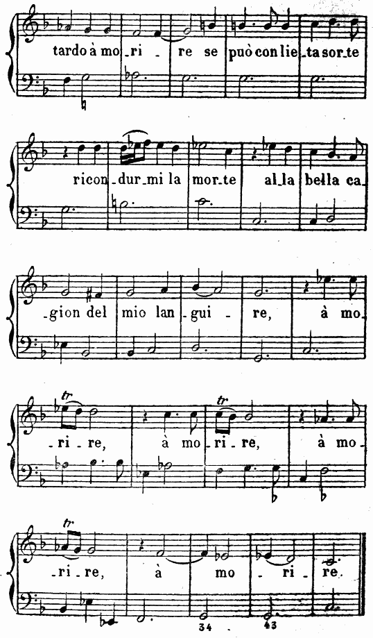 Cette cantilène est répétée pour les strophes suivantes; mais les chanteurs ont coutume d’y introduire des passages de bravoure, qui en modifient un peu la monotonie. Ce genre d’air se reproduisait de Mai en Mai, d’une façon si traditionnelle qu’on voit souvent marqué sur le texte de ces pièces campagnardes: Da cantarsi sull’aria del Maggio (A chanter sur l’air du Mai).