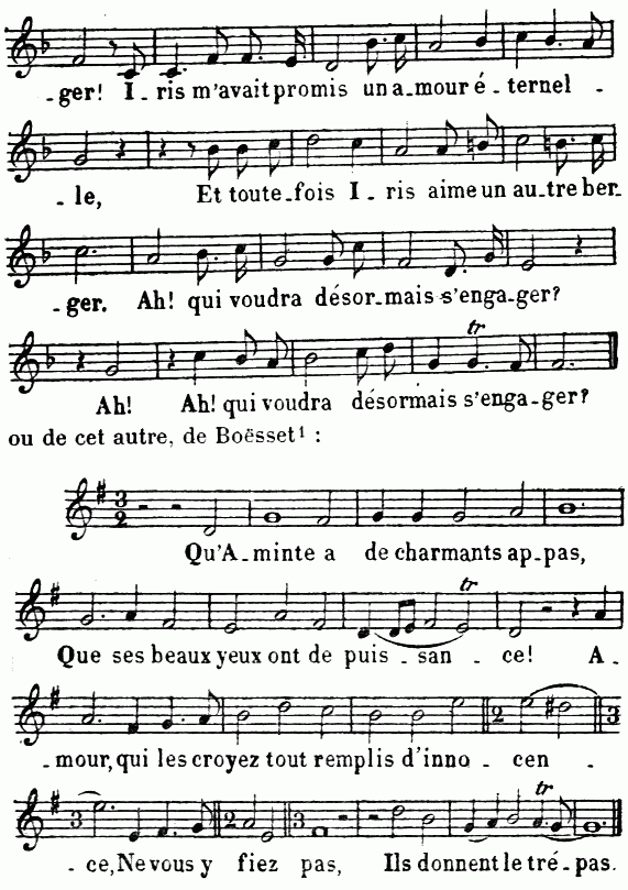 [472] Une fille, par exemple, assure à sa mère qu’elle ne connaît point l’amour; mais, pendant qu’elle affecte l’indifférence par un chant simple et monotone, l’orchestre exprime le tourment de son cœur amoureux. Un nigaud veut-il exprimer son amour, ou son courage? S’il est vraiment animé, il doit avoir les accents de sa passion; mais l’orchestre, par sa monotonie, nous montrera le petit bout d’oreille. En général, le sentiment doit être dans le chant; l’esprit, les gestes, les mines doivent être dans les accompagnements.» (Ibid., I, 169-172.)