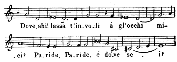 La musique en a disparu; mais les spectacles populaires, parallèles à ces représentations bourgeoises et aristocratiques, les Mai de la campagne toscane, qui se sont conservés depuis le XVe siècle jusqu’à nos jours, avec peu de changements, nous fournissent encore des indications précises sur ce que devait être ce chant primitif au théâtre. Le Mai est en stances de quatre vers de huit syllabes, rimant le premier avec le quatrième, le second avec le troisième. La musique est une cantilène perpétuelle avec quelques trilles et ornements vocaux. Le chant est lent, uniforme, d’ordinaire sans accompagnement instrumental, parfois pourtant avec violon et contrebasse. Il est dans la tonalité majeure. Le rythme est marqué par l’accentuation de la première note de chaque mesure, qui correspond à la troisième et à la septième syllabe de chaque vers. En voici un exemple, que M. Alessandro d’Ancona a eu l’obligeance de me communiquer: