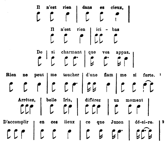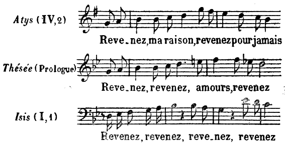 [471] Lorsque Andromaque récite (dans l’opéra du même nom), elle est presque toujours accompagnée de trois flûtes traversières qui forment harmonie... C’est, je crois, la première fois qu’on a eu l’idée d’adopter les mêmes instruments pour accompagner partout le récitatif d’un rôle qu’on veut distinguer.» (Ibid., I, 356.)