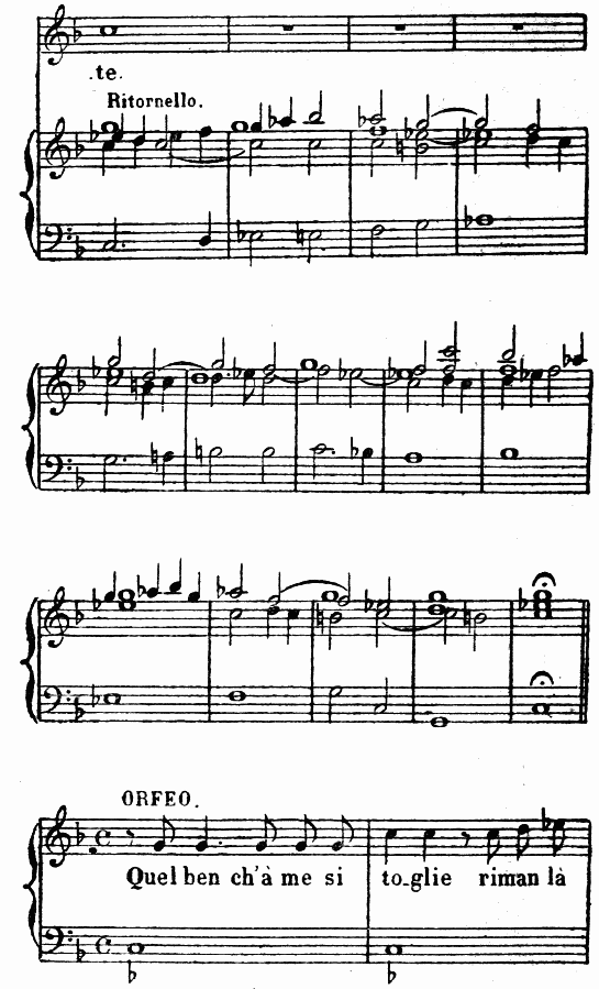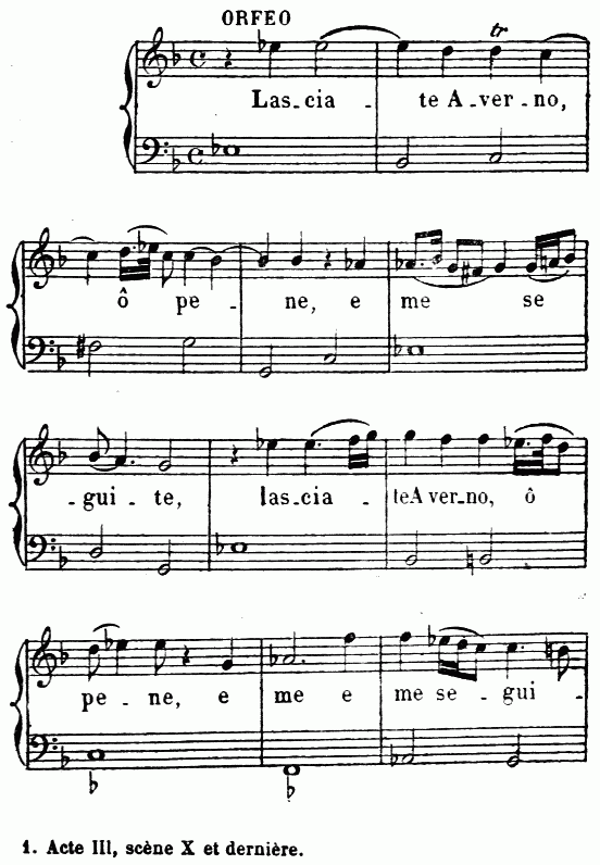 On sait que les premiers essais de l’opéra florentin à la fin du XVIe siècle, repris et consacrés au commencement du XVIIe par le génie de Monteverde, furent deux pastorales en musique: une Dafne, traitée successivement, de 1594 à 1608, par Corsi, Peri, Caccini et Marco da Gagliano; et une Euridice (ou un Orfeo), traités tour à tour, de 1600 à 1607, par Peri, Caccini, Monteverde, et, un peu plus tard, par Stefano Landi (1619) et Luigi Rossi (1647).