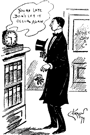 Employer (who simply WON'T take any excuse for unpunctuality). "You are very late, Mr. Jones. Go back at once, and come at the proper time!"