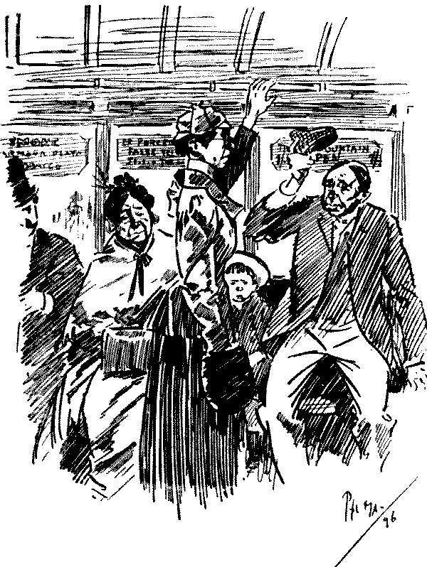 Straphanger (in first-class compartment, to first-class passenger). "I say, guv'nor, 'ang on to this 'ere strap a minute, will yer, while I get a light?"
