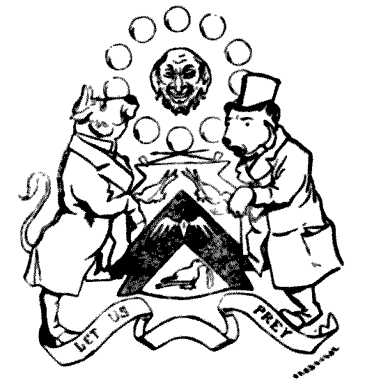 On a chevron vert, a pigeon plucked proper, between three rooks peckant, clawed and beaked gules. Crest: a head Semitic grimnant, winkant, above two pipes laid saltier-wise, argent, environed with a halo of bubbles or. Supporters: a bull and bear rampant sable, dented, hoofed and clawed gules. Motto: "Let us prey."