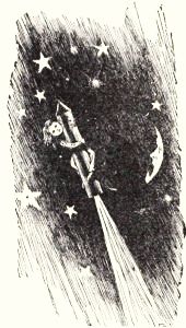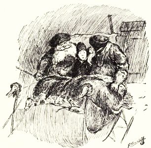 Then, before he knew how it happened, Jimmieboy found himself wrapped up warmly in a great fur coat, with a seal-skin cap on his head, and the dearest, warmest ear-tabs over his ears, sitting in the middle of the sleigh between the two huge, jolly-faced, members of the Claus family. The long lash of the whip snapped in the frosty air, at the sound of which the reindeer[Pg 17] sprang forward and dragged the toy-laden cutter off on its aerial flight.